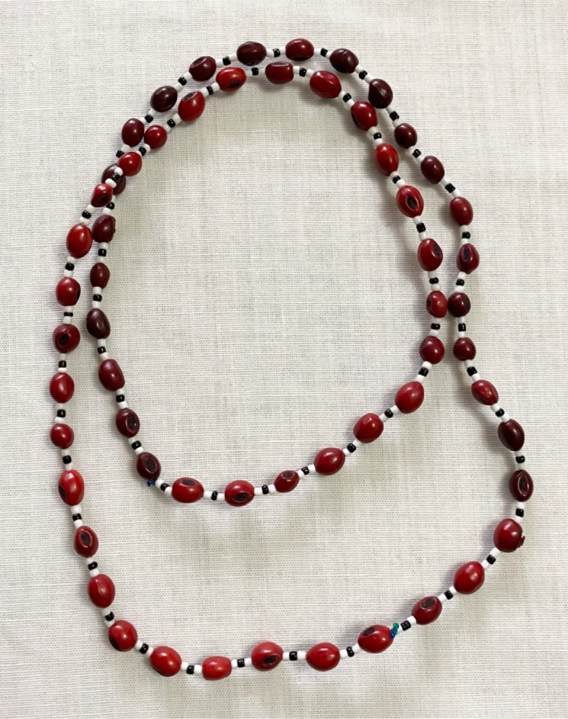 Selling a unique red seed bead necklace from South Africa. It's in great condition and measures approximately 28 inches in length. Perfect for adding a pop of colour to any outfit!