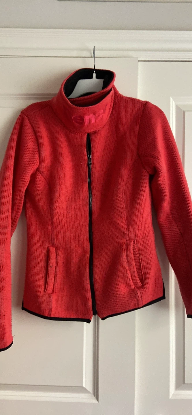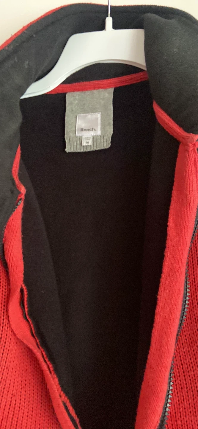 Cozy red knit jacket from Bench, perfect for layering! It's a size medium and features a black lining and trim. Great for adding a pop of colour to your wardrobe!