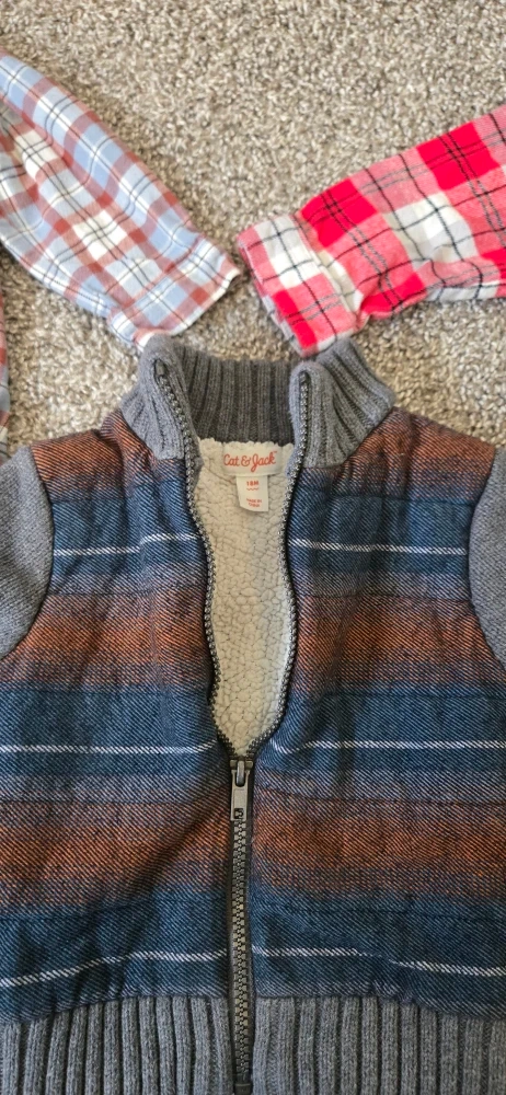 Brown, blue and gray fleece sweater jacket, is great for in the car.