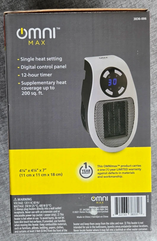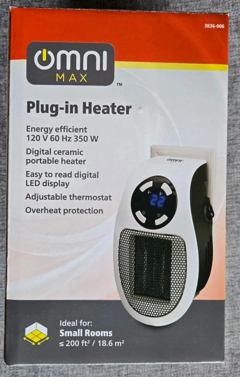 Selling an OmniMax plug-in heater, perfect for small rooms up to 200 sq ft! It's energy efficient at 120V 60Hz 350W.