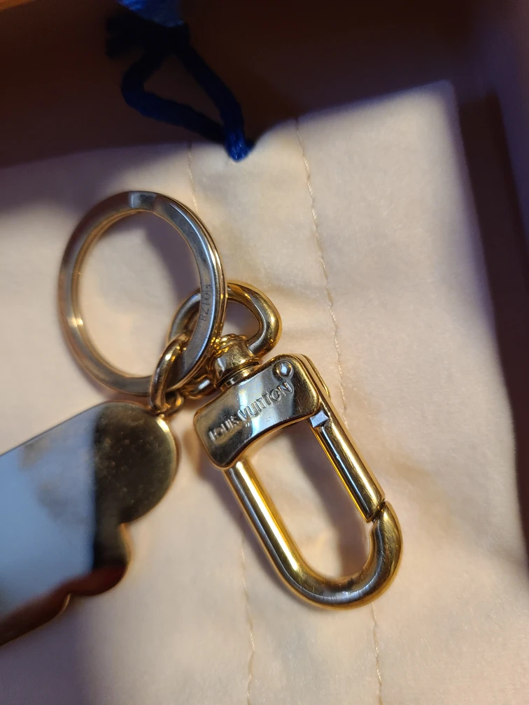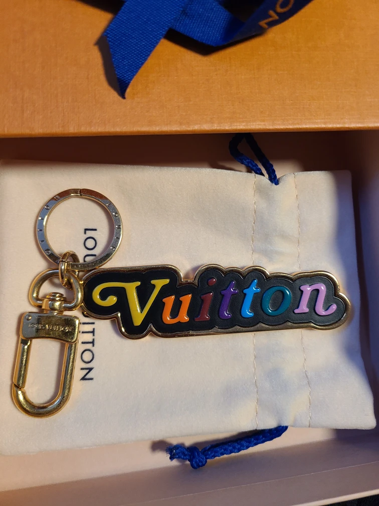 Selling an authentic Louis Vuitton key holder/bag charm. It's a gold-tone key holder with the Louis Vuitton logo in rainbow colours. There are some visible scratches from use.