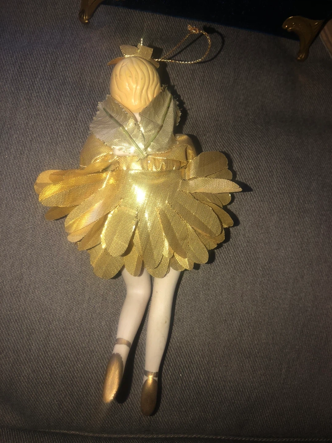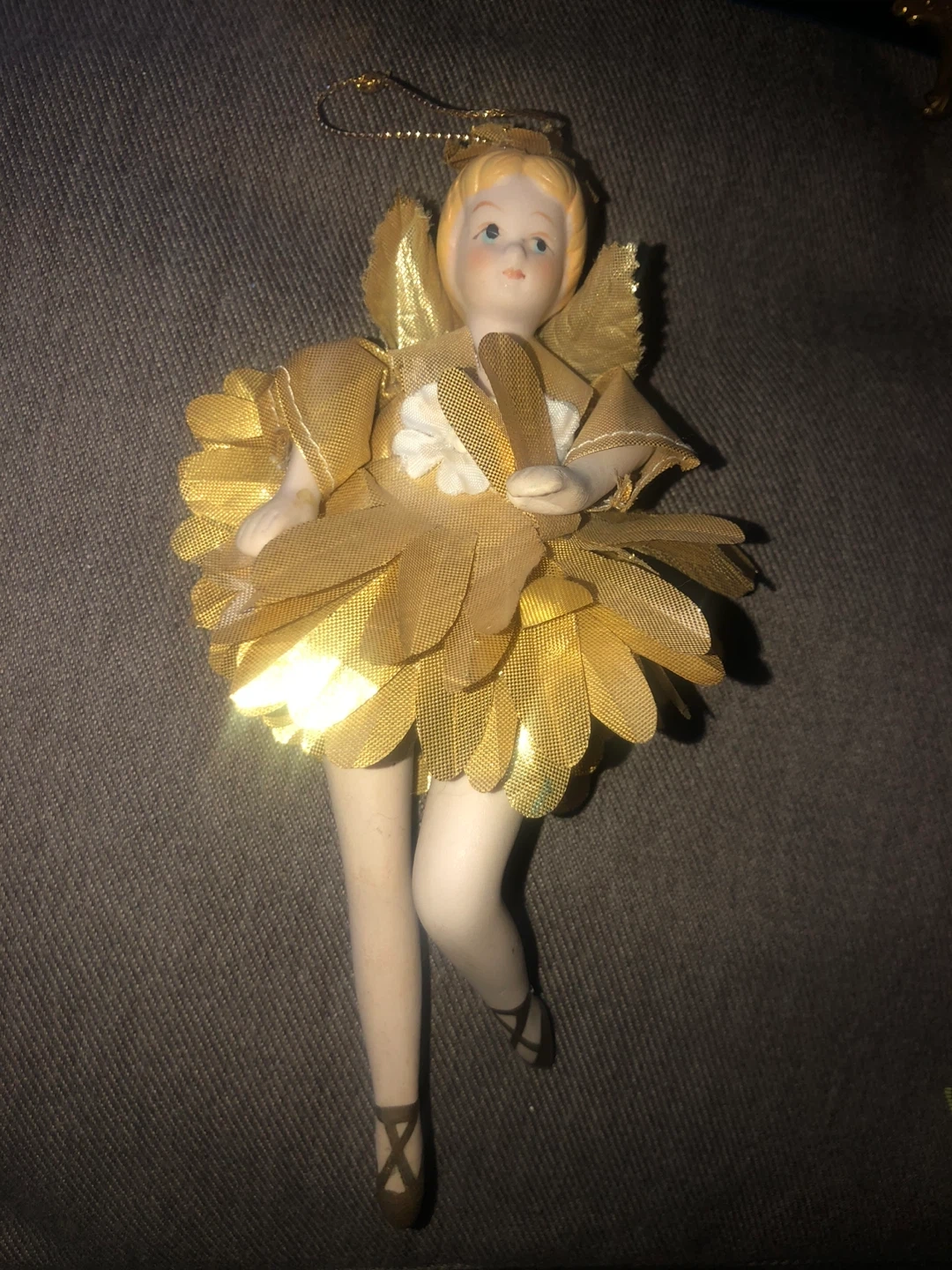 A beautiful porcelain ballerina ornament, perfect for adding a touch of elegance to your holiday decor or as a charming addition to any collection! She's wearing a gold dress and ballet shoes