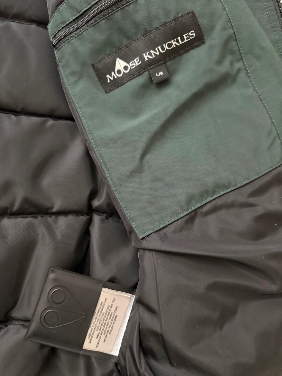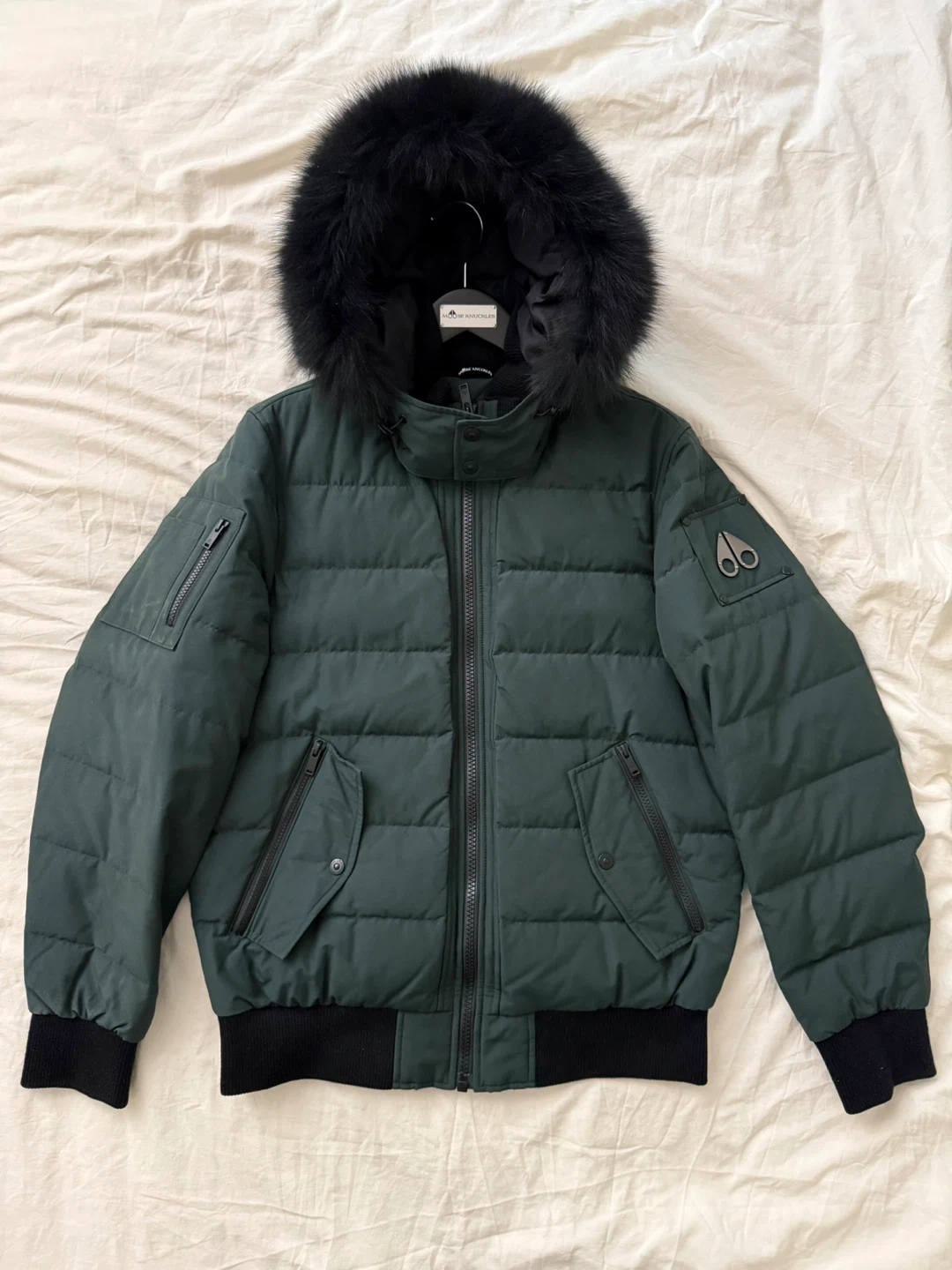 Selling a Moose Knuckles bomber jacket in great condition! It's a size Large and features a stylish design with a fur-trimmed hood. Perfect for staying warm and fashionable during the colder months