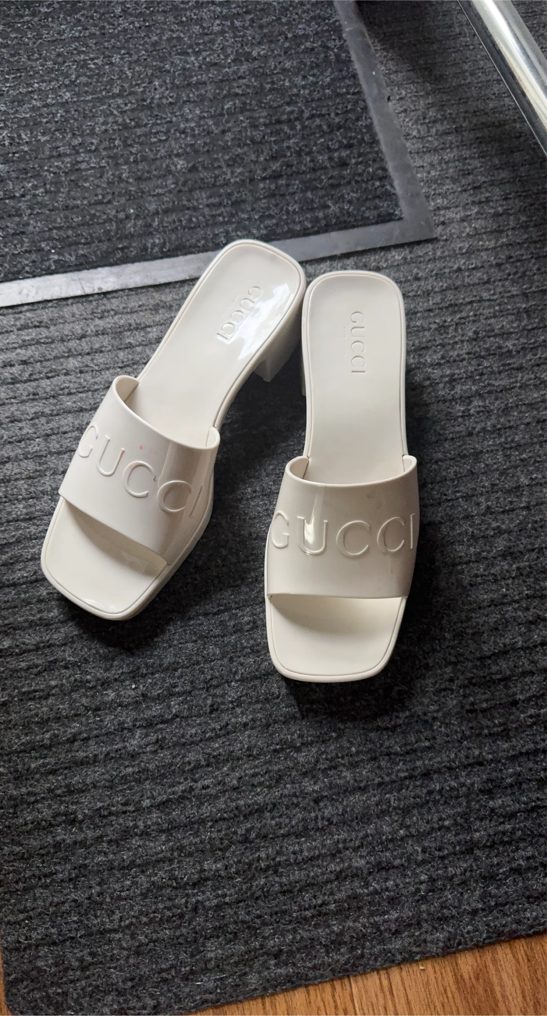 These are a pair of Gucci women's slide sandals in white rubber. They are in good condition and feature the Gucci logo embossed on the strap and insole. Perfect for adding a touch of luxury to your casual look!