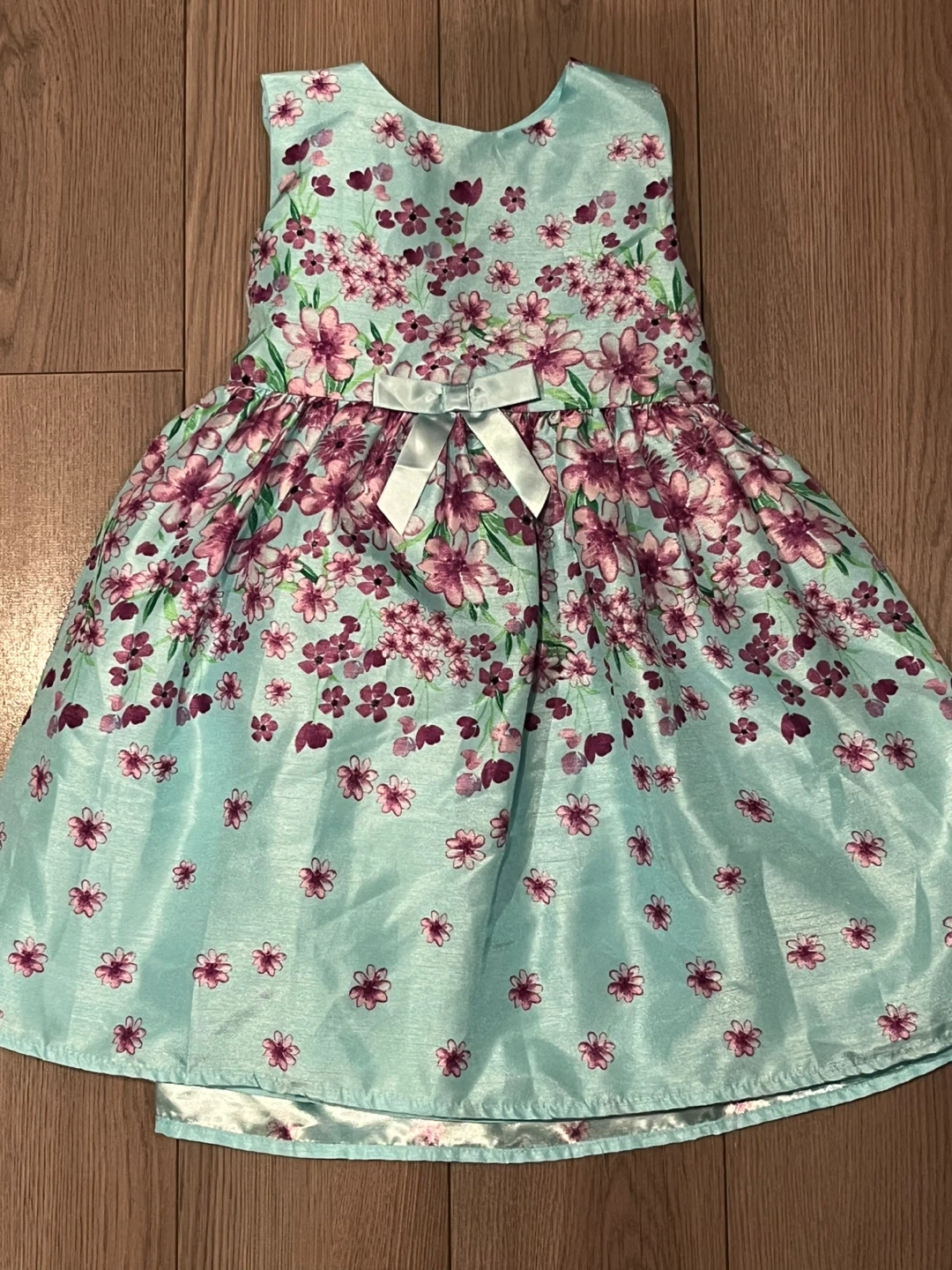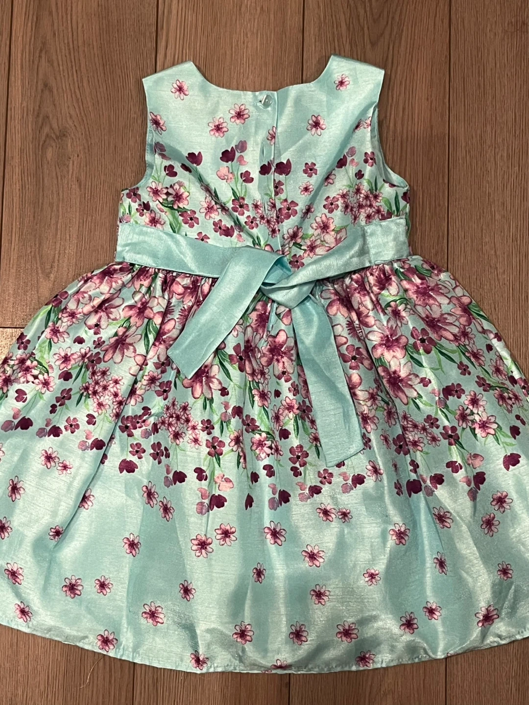 Here's a cute George brand dress, perfect for your little one! It features a lovely floral pattern on a light blue background and comes in size 4T. It has a sweet little bow at the waist, adding an extra touch of charm.