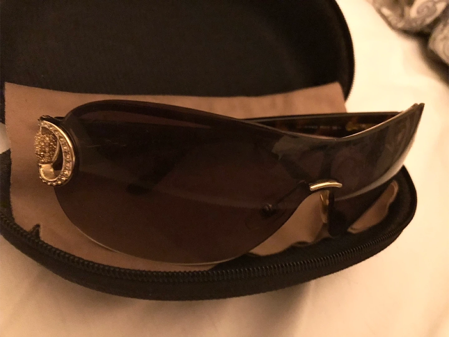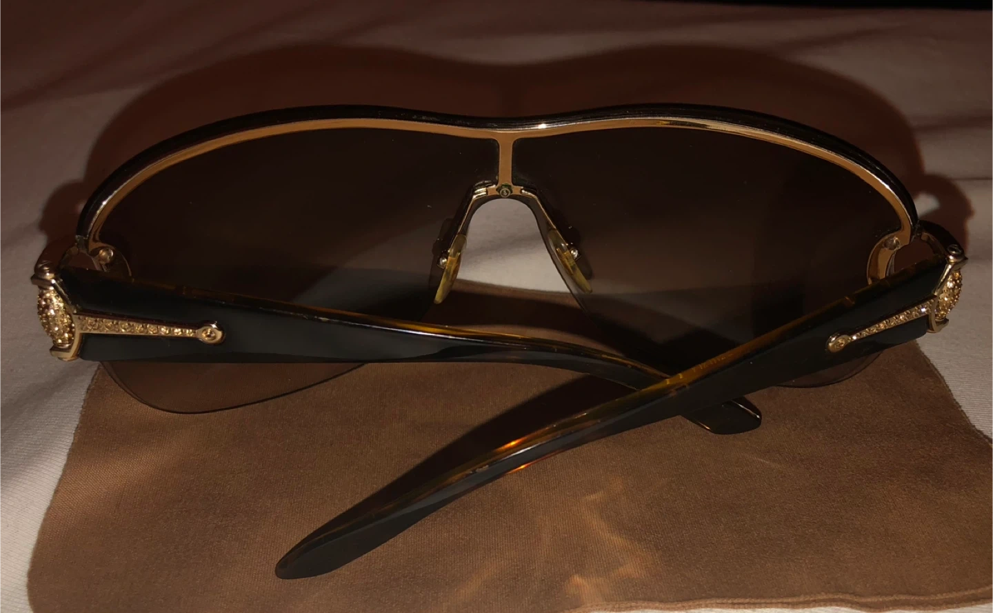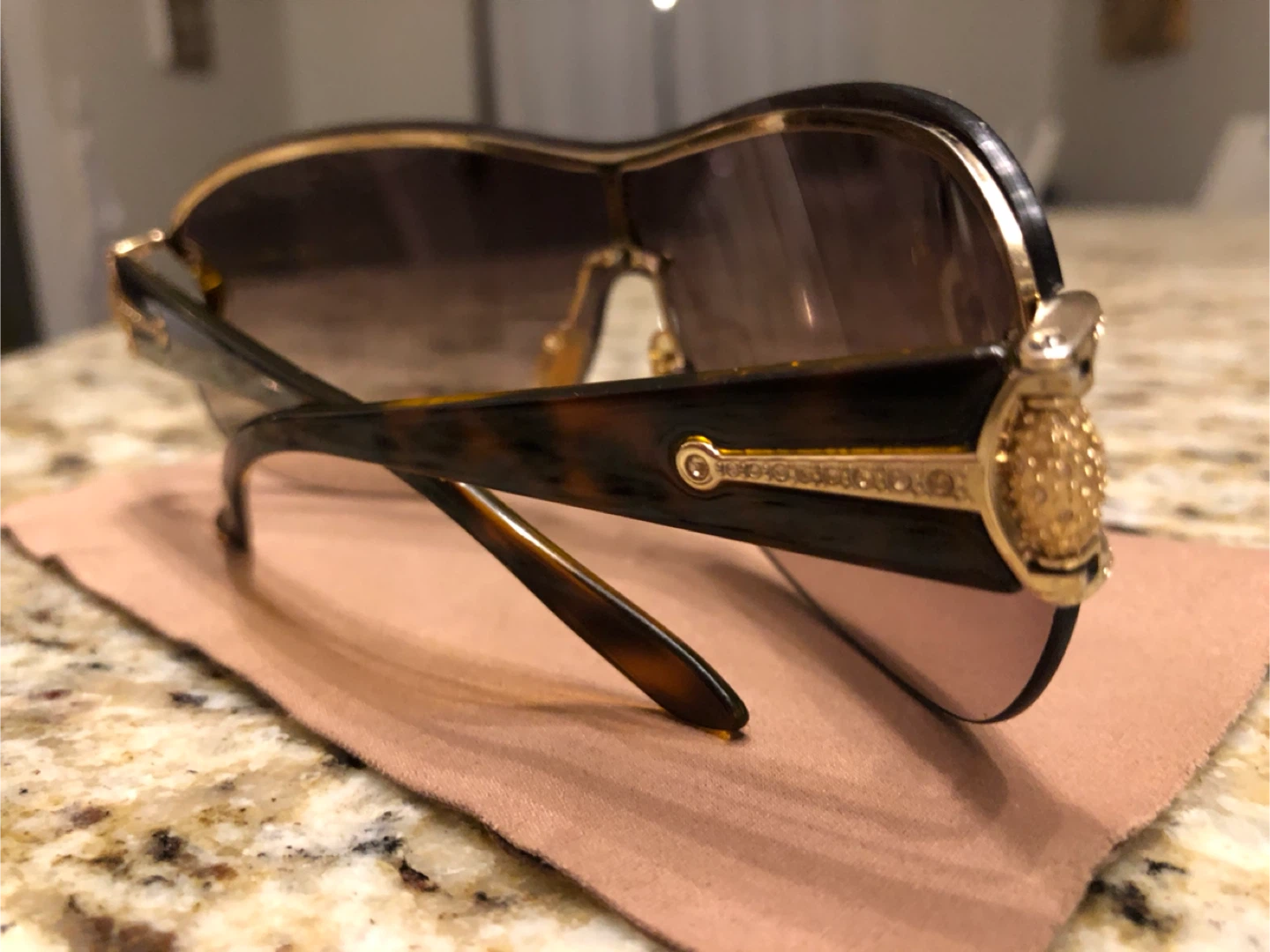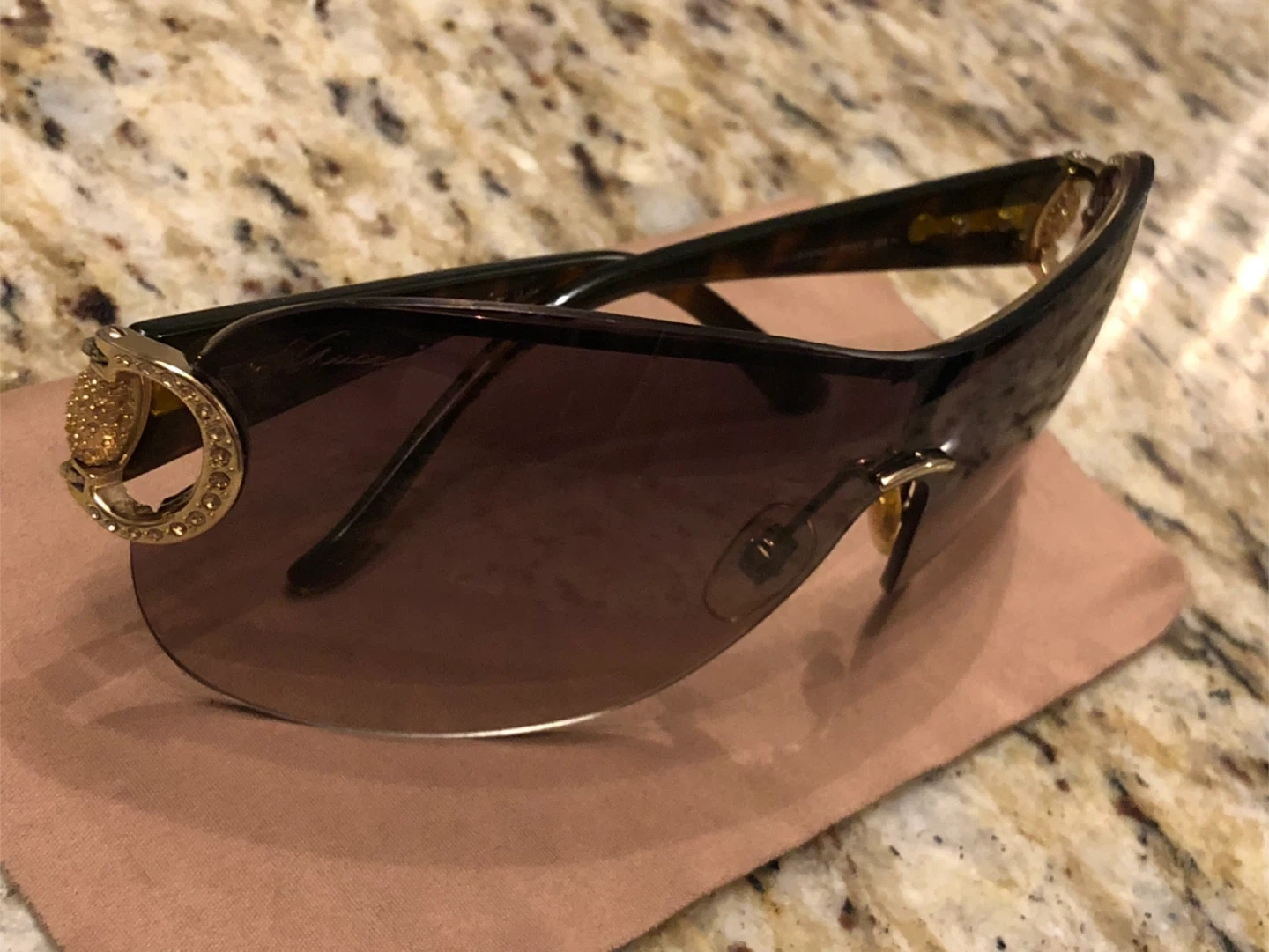 Selling a pair of Authentic Gucci sunglasses in excellent condition made in Italy. They have a stylish tortoise shell pattern on the arms and gold detailing with crystals. Perfect for adding a touch of luxury to your look!