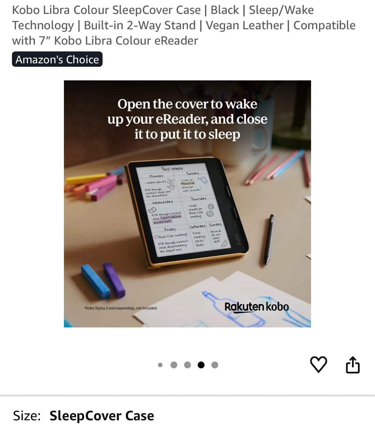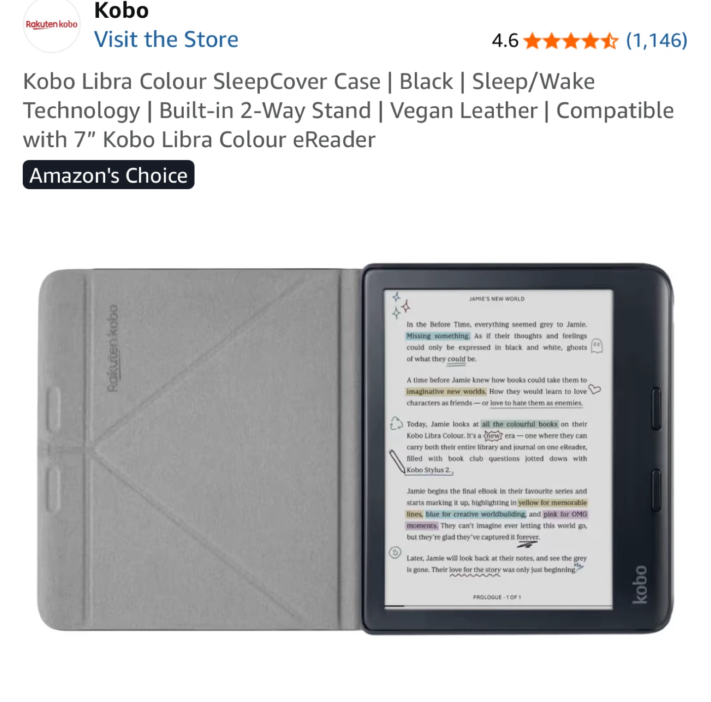 Selling a Kobo Libra Colour SleepCover Case in black! It features sleep/wake technology and a built-in 2-way stand. Compatible with the 7" Kobo Libra Colour eReader. The case is made of vegan leather and comes in its original box