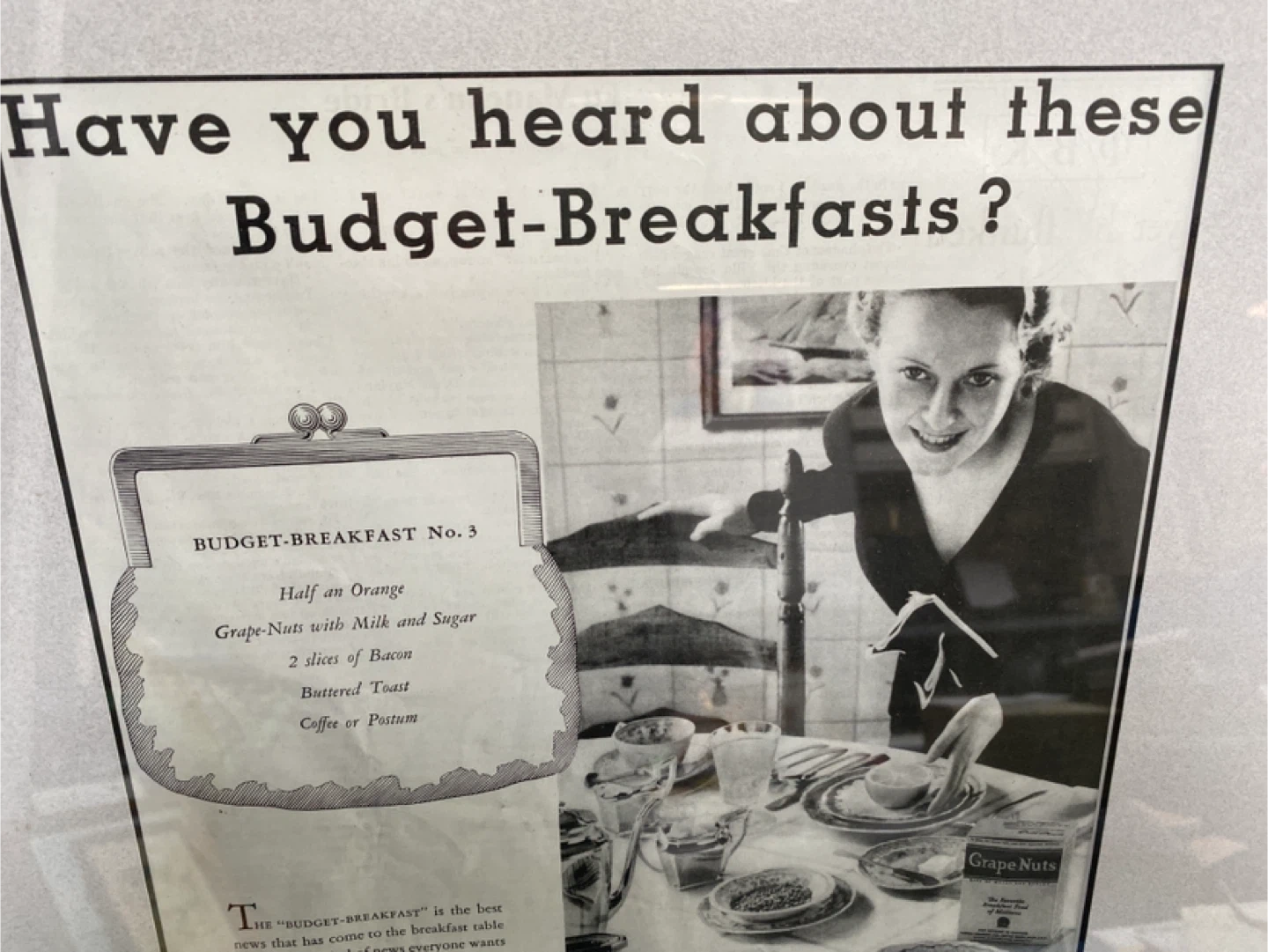 I'm selling a vintage framed advertisement for Grape-Nuts cereal. It's a charming piece of nostalgia that would look great in a kitchen or dining room. The advertisement features a recipe for a budget breakfast and a classic black and white photo. Size = 54 x 44.5 cm The Frame alone is worth more than $20!