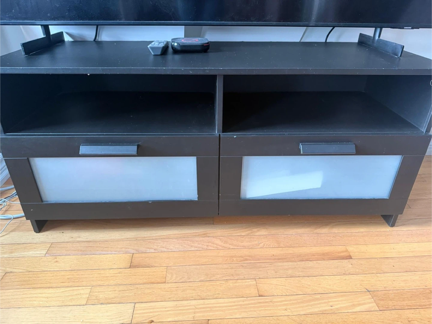 Selling a black TV stand with drawers. It has a sleek design and offers ample storage space with its two drawers and open shelves. Perfect for organizing your media devices and accessories!