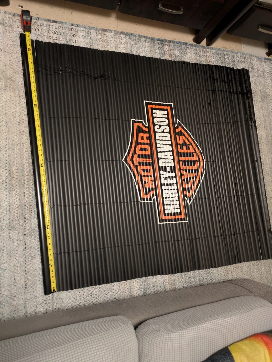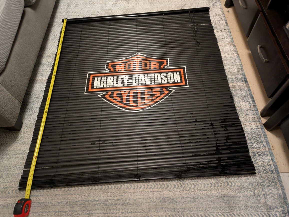 Selling a custom made Harley-Davidson window blind! It's black and measures approximately 50 inches wide by 48-60 inches tall. It has the classic Harley-Davidson logo on it