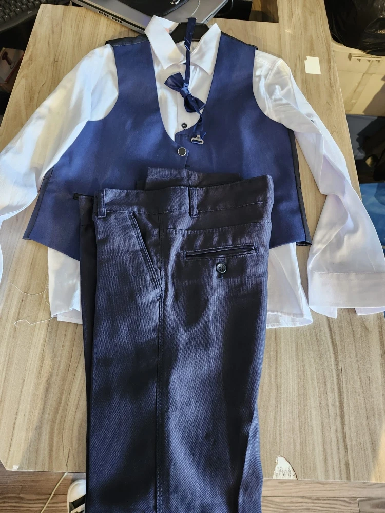 Selling a charming four-piece suit for boys! It includes a crisp white shirt, a smart navy blue vest, matching pants, and a cute bow tie. Perfect for special occasions or dressing up.