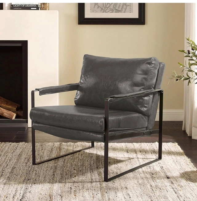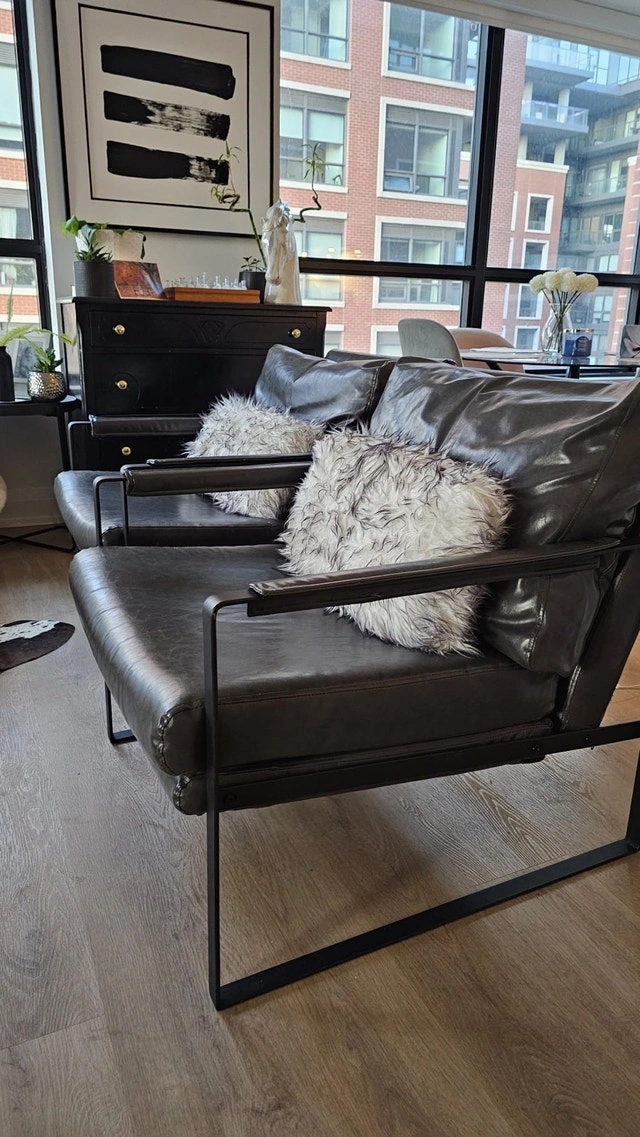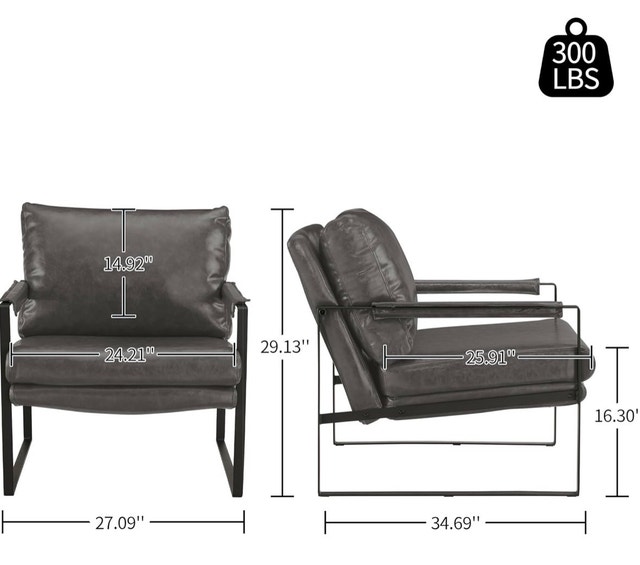 2 x Mid-Century Modern Accent Chairs Faux Leather $300 each $550 for both 【Classic Design】Simple lines and a square silhouette create this armchair, It brings a mid-century modern style and greatly uplifts your living room, bedroom, or office. 【Comfort】Adopt the high-quality PU leather filled with high-density foam to provide you with comfort, and release your day's fatigue and stress. Wrapped padded armrests for added comfort. 【Sturdy & Durable】Featuring a black powder-coated metal frame, it provides better stability and load-bearing. Equipped with protector pads that can prevent floor scratches. 【Ergonomic Design】The ergonomic design and the 105-degree tilt angle that you can fully enjoy and relax your body. 【Dimension】Product Size: 26.77" W x 34.65"D x 29.13"H; Seat Size: 24.21"W x 19.29"D; Seat Height: 16.54". Weight Capacity: 264 lbs.