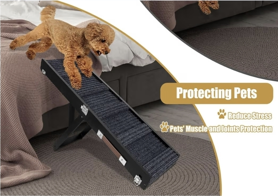 This new adjustable floding pet ramp, is perfect for helping your furry friends reach sofas or beds with ease. It's designed to protect your pet's muscles and joints, reducing stress during climbing. The ramp features an anti-slip blanket with raised strips for added safety and a solid lock for secure use. It's also easy to store when not in use