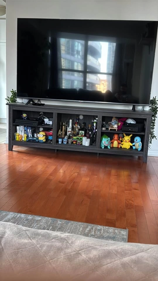 Modern Farmhouse TV Stand with three adjustable shelves organize décor and electronics neatly