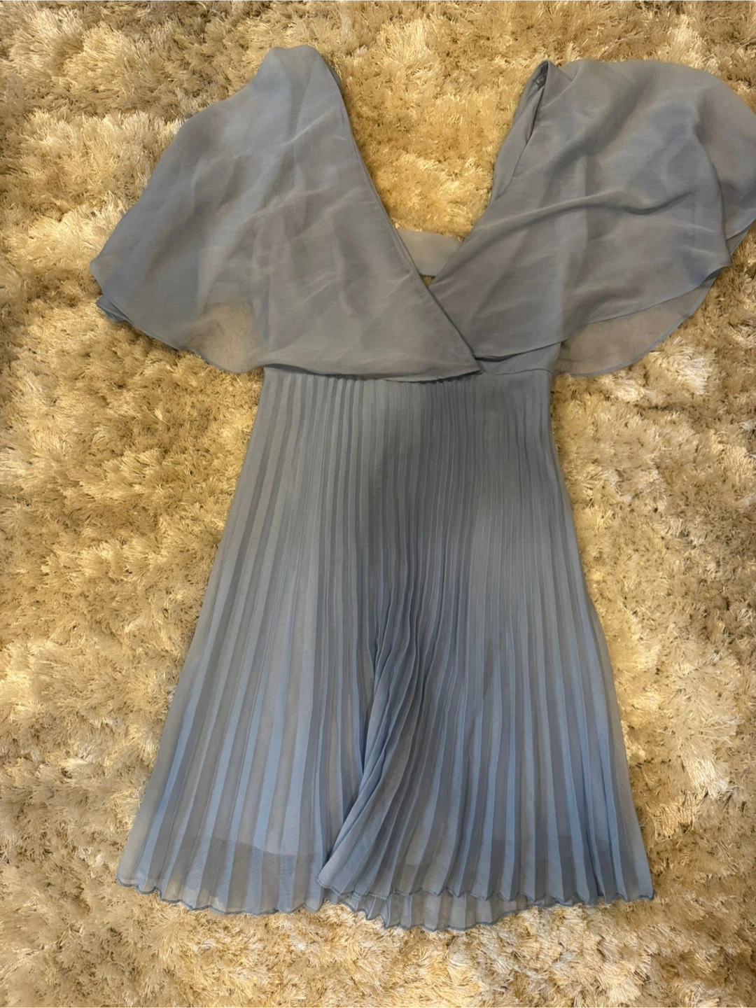 Here's a lovely blue dress with pleated details! It features a unique flutter sleeve design and a flattering silhouette. Perfect for a special occasion or a stylish everyday look