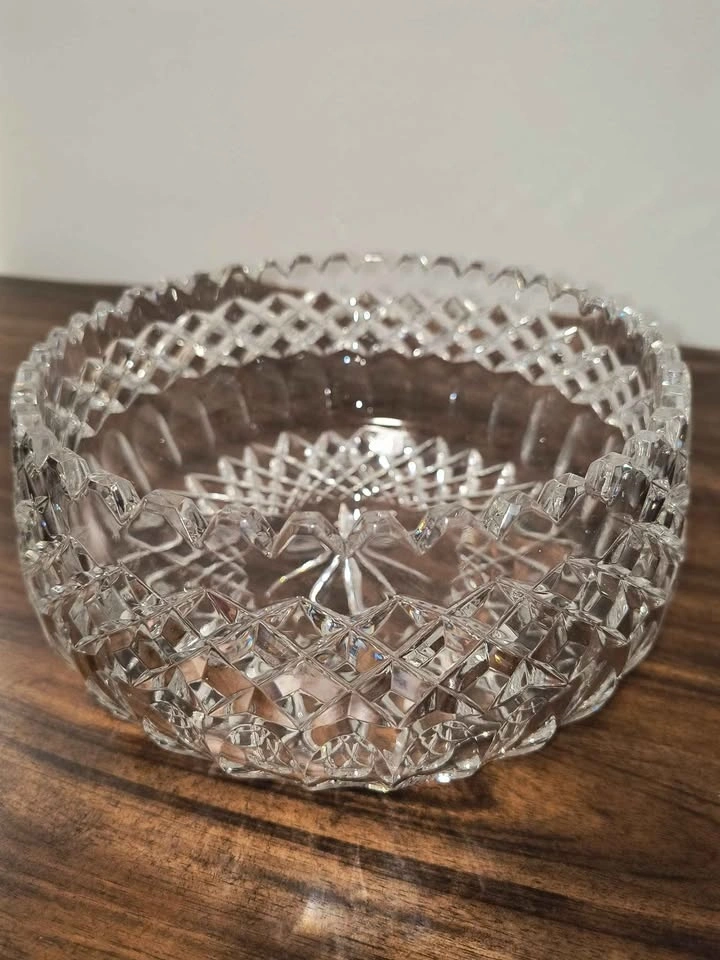 Beautiful vintage cut crystal bowl with a stunning starburst base and detailed diamond-patterned sides.
