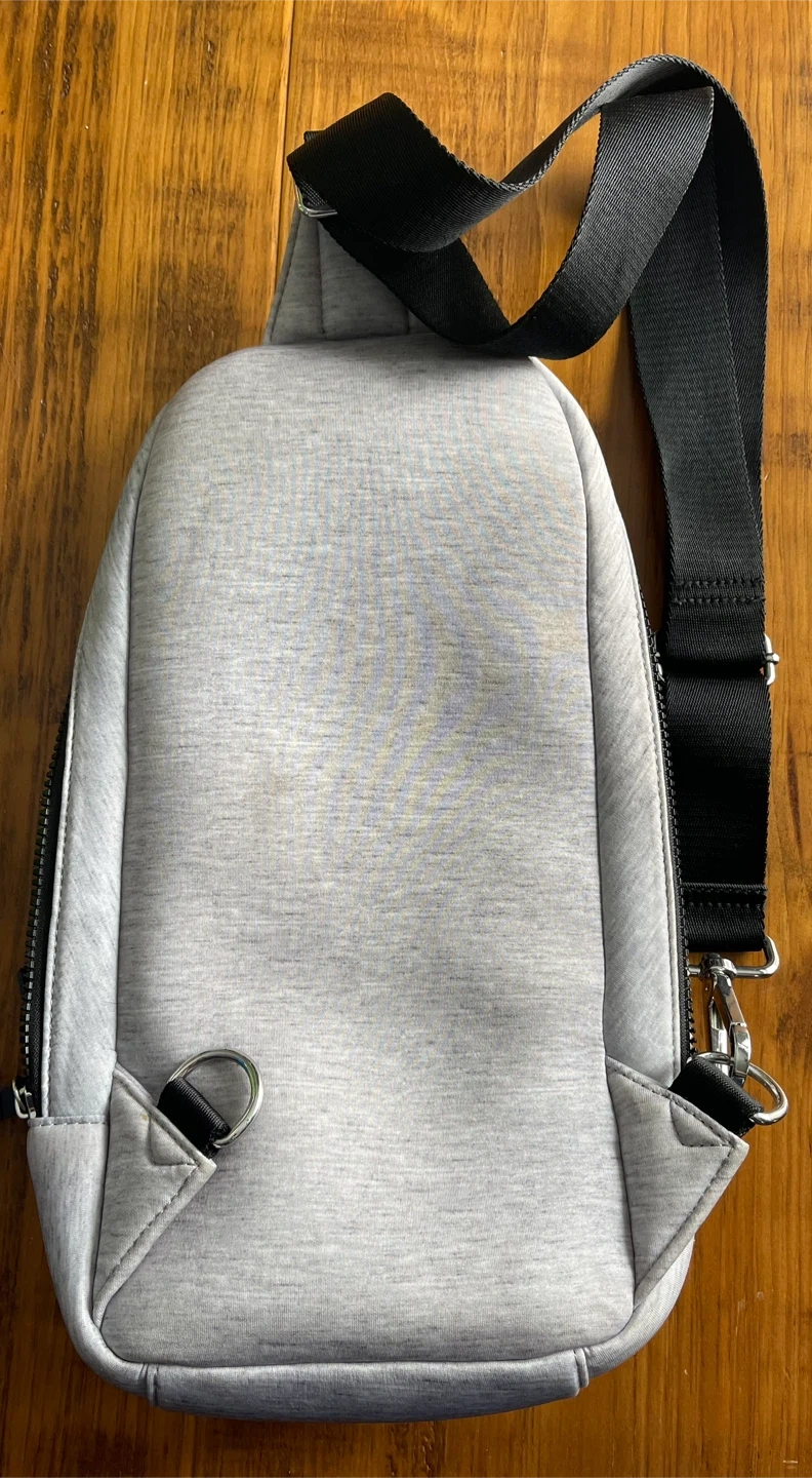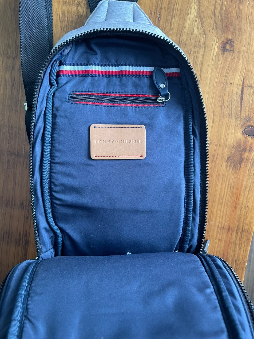 Tommy Hilfiger sling bag in a nice grey colour. It's in great condition and perfect for carrying your essentials while keeping your hands free. The bag features adjustable straps and multiple compartments for organization. Stylish and practical!