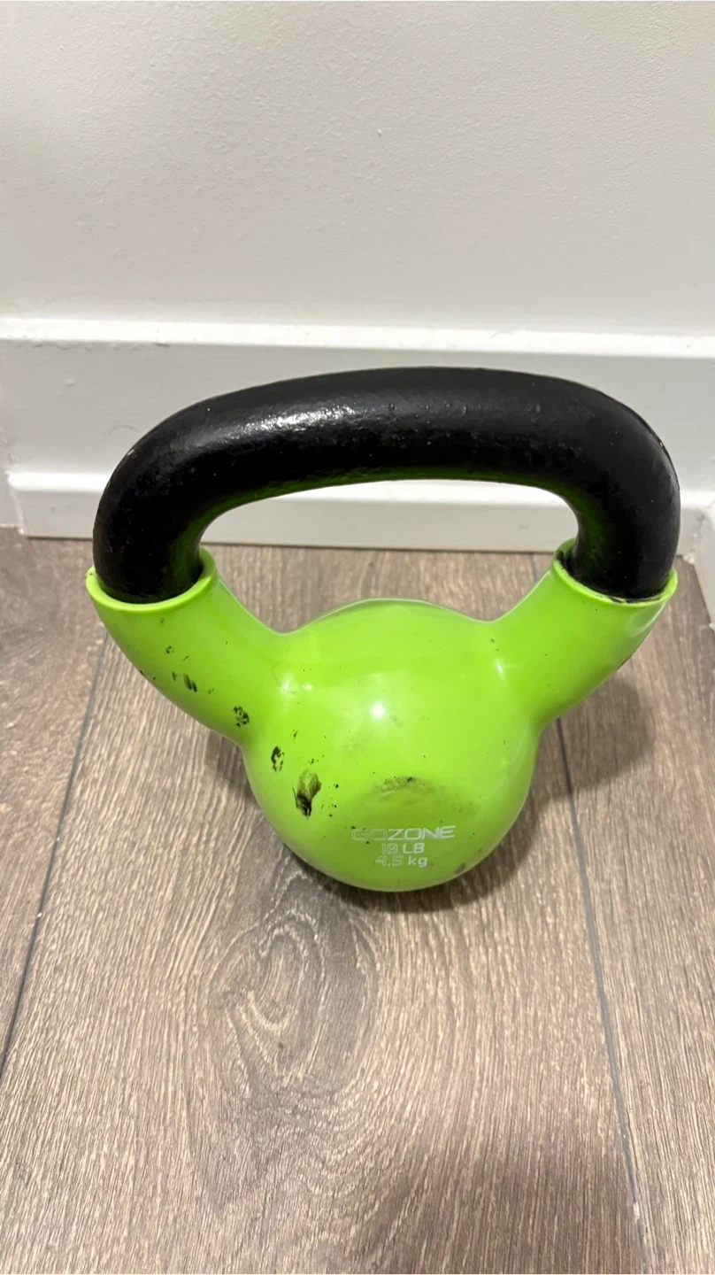 Selling a GoZone kettlebell, perfect for your home workouts! It weighs 10 lbs (4.5 kg) and is in green and black. There are some signs of use, but it's still in great working condition!