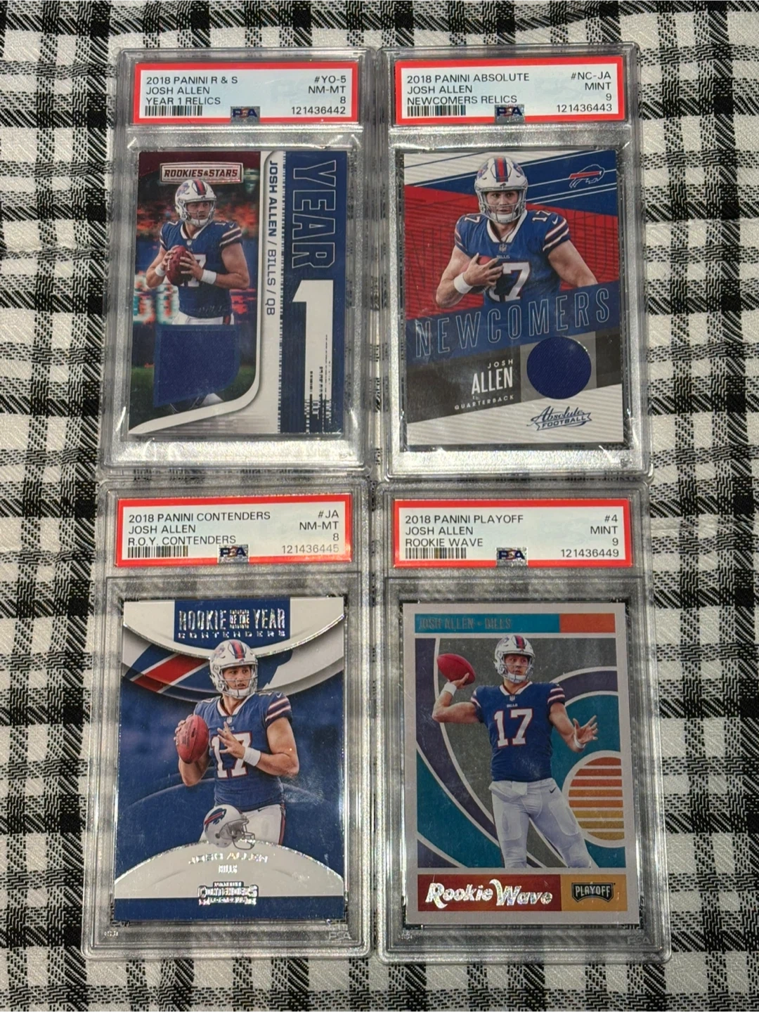 Selling a set of 2018 Panini Josh Allen football cards. Includes R&S Year 1 Relics, Absolute Newcomers Relics, Contenders R.O.Y. Contenders, and Playoff Rookie Wave cards. All cards are graded and in mint condition!