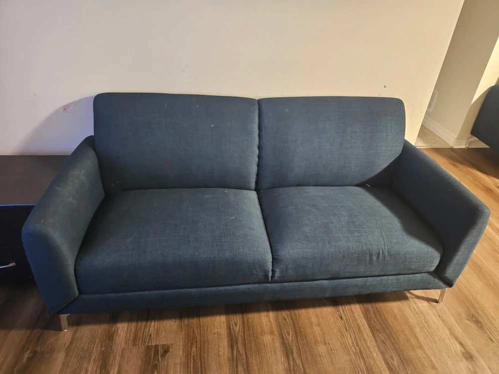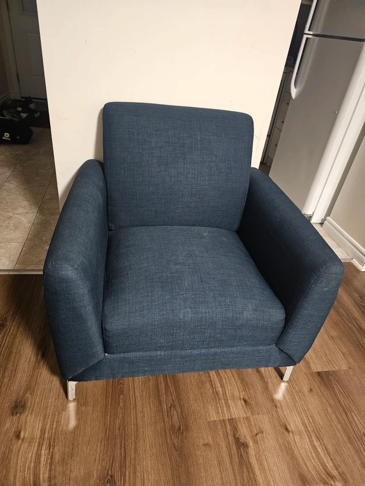 Here's a comfy loveseat and armchair set! They're in good condition and would be perfect for a living room or den. The set features a stylish, modern design with a blue fabric upholstery and sleek metal legs. Perfect for adding a touch of elegance to your space!