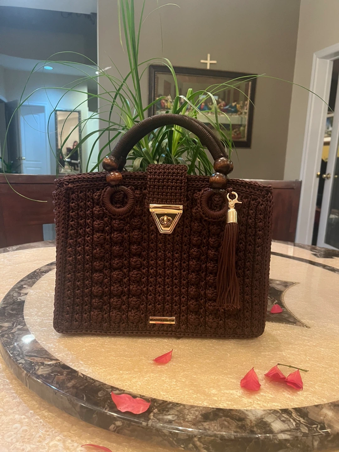 Selling a beautiful, handmade crochet handbag in a rich brown colour. It features unique wooden bead detailing on the handles and a stylish tassel accent. This one-of-a-kind bag is perfect for adding a touch of artisanal charm to any outfit!