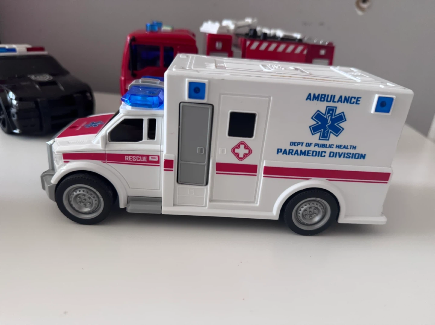 Selling a toy food truck in great condition, along with some other toy vehicles like a police car, ambulance, fire truck, helicopter and garbage truck! Perfect for imaginative play