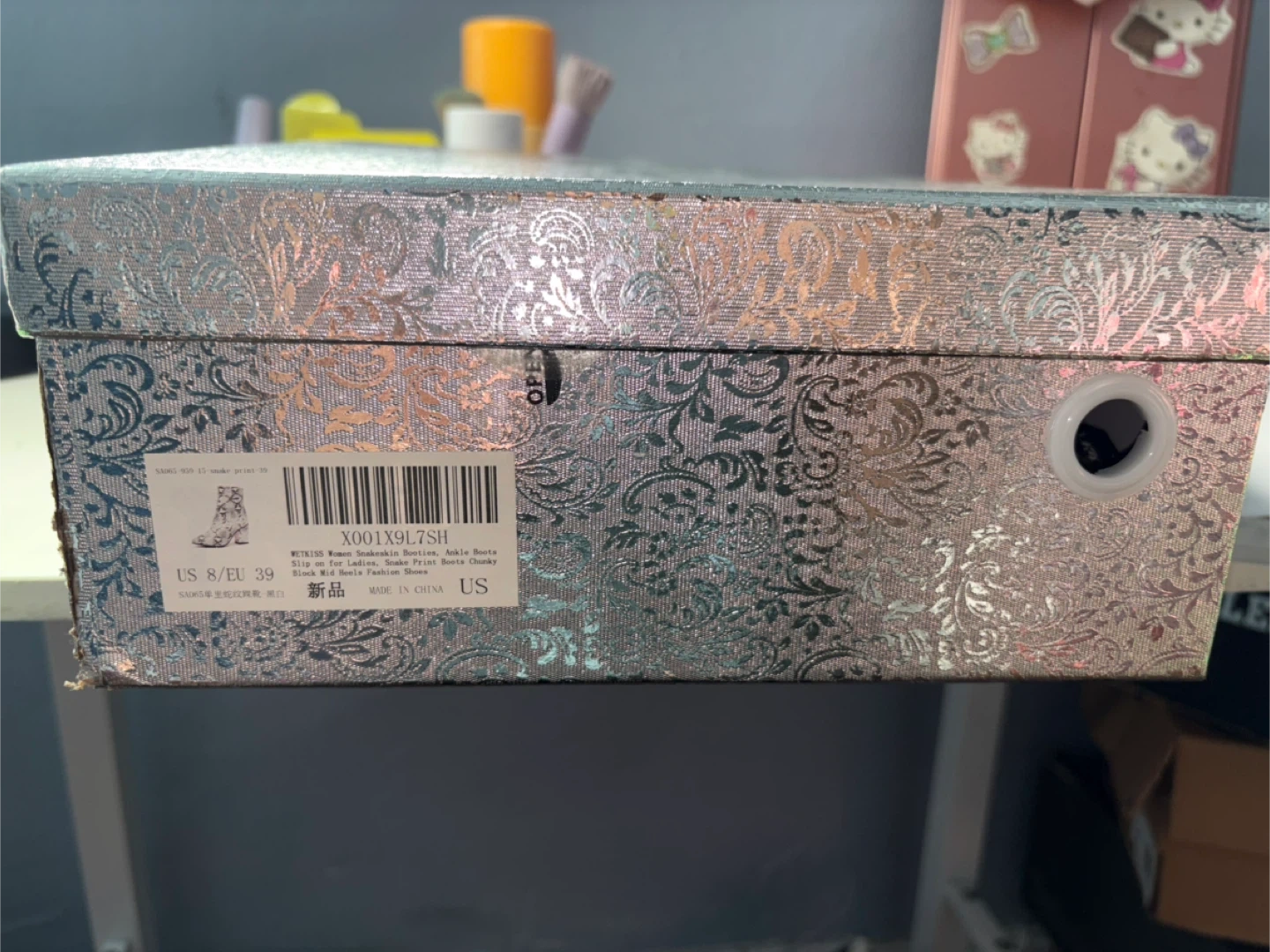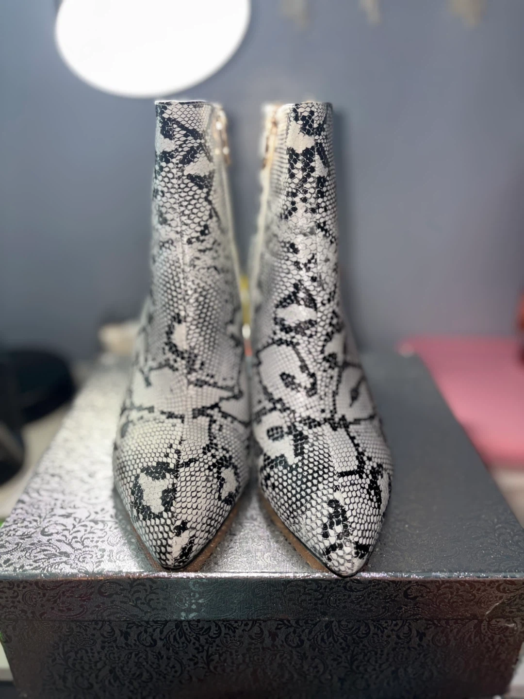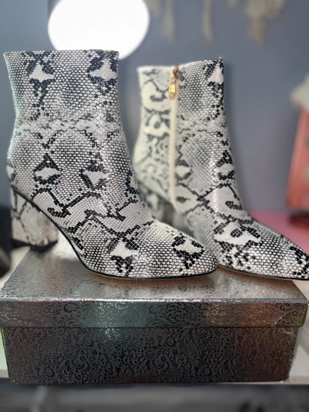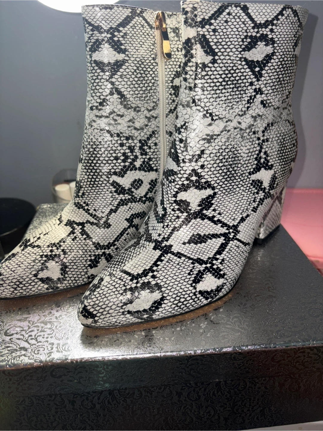 These booties feature a stylish snake print design! They are a slip-on style with a chunky heel. The size is US 8 / EU 39. Comes with the original box. Used once.
