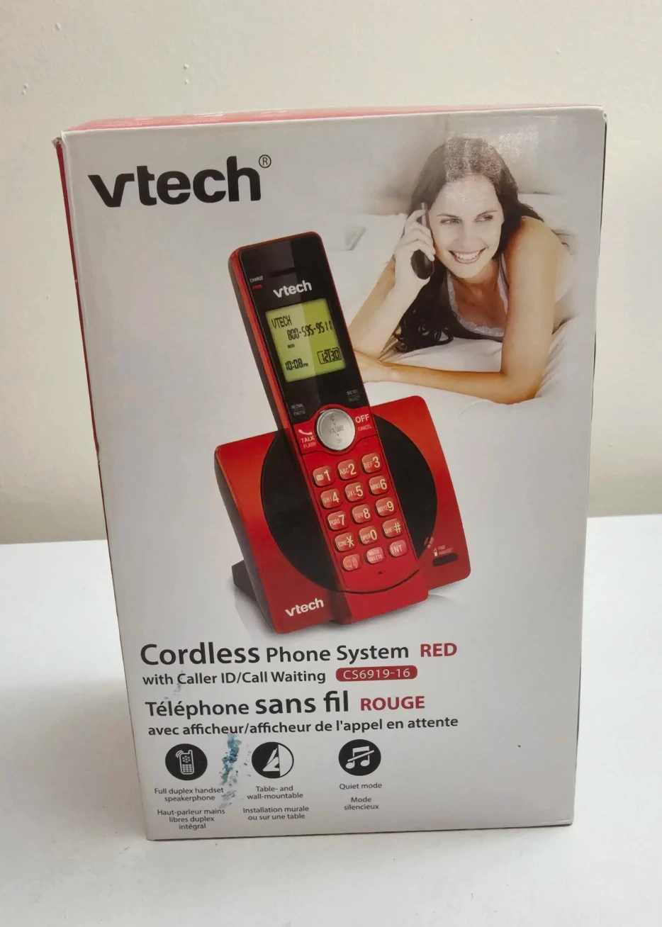 Selling a VTech CS6919-16 Cordless Phone System in red! It comes with Caller ID and Call Waiting features. The phone is table-and wall-mountable and also has a quiet mode. Includes a full duplex handset speakerphone