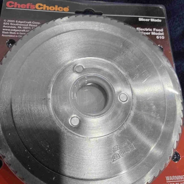 Collection of the chef's choice trizor cutlery. Approximately 7 inches in diameter. Non-serrated blade. Color name value is metallic. Compatible with Chef'sChoice food slicers only.