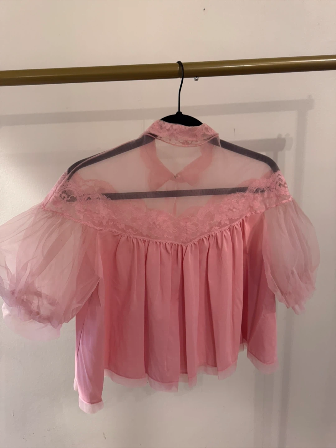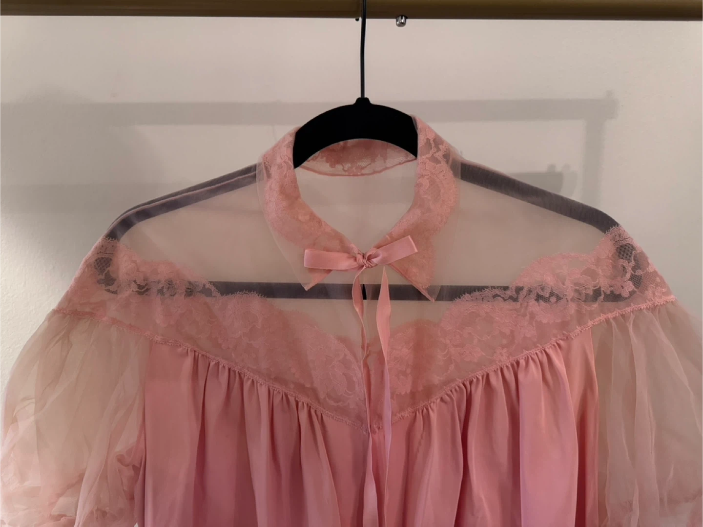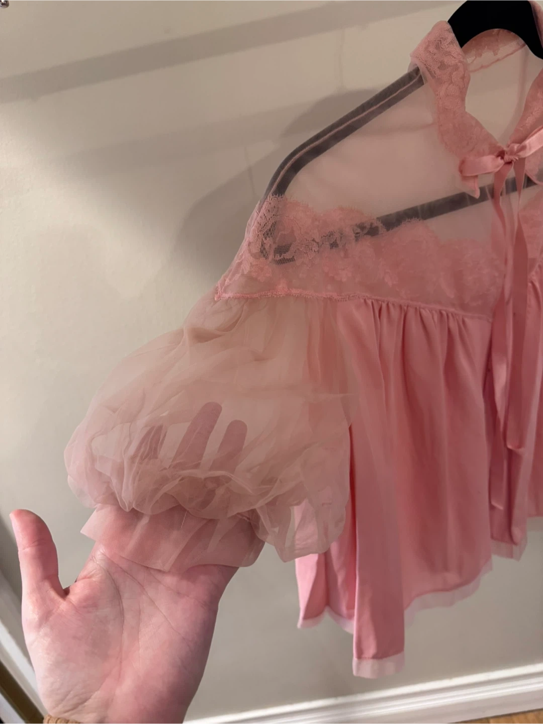 This is a cute pink top with lace detailing! It's in great condition and ready for a new home. The top features sheer sleeves and a ribbon tie at the collar. Perfect for adding a touch of vintage charm to your wardrobe
