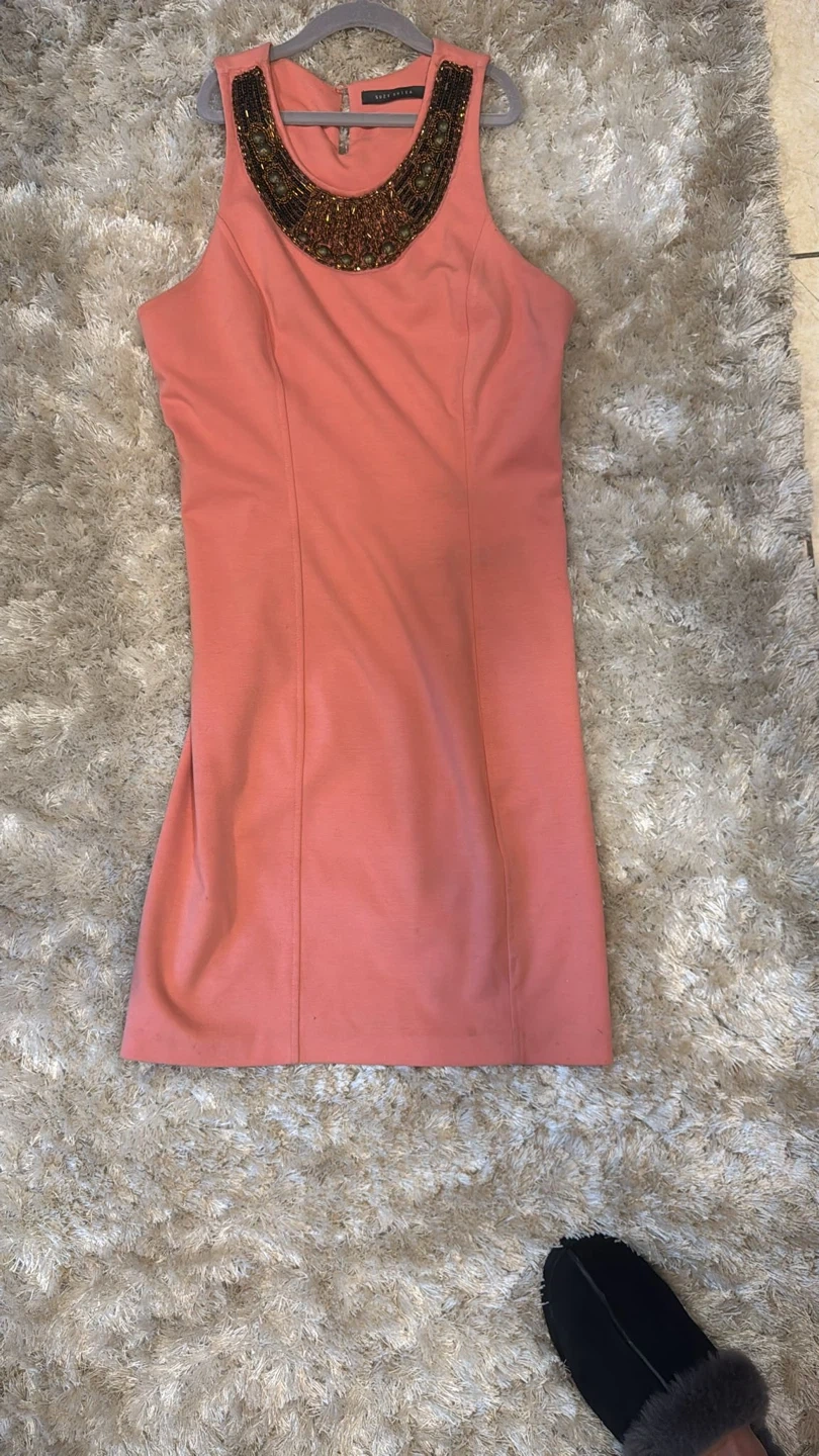 This is a Suzy Shier coral dress. It features a beaded neckline. It's in good condition and ready for a new home!