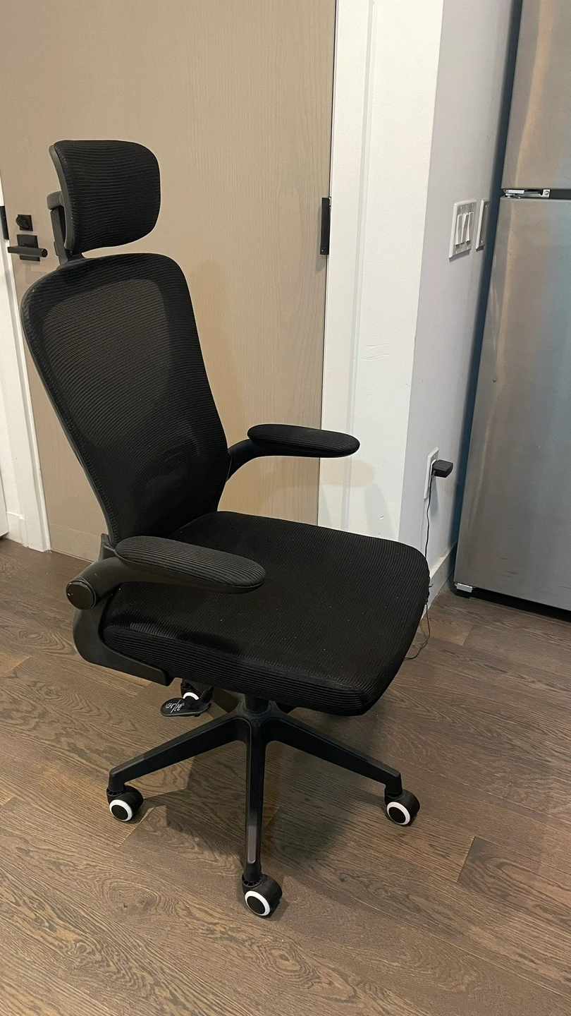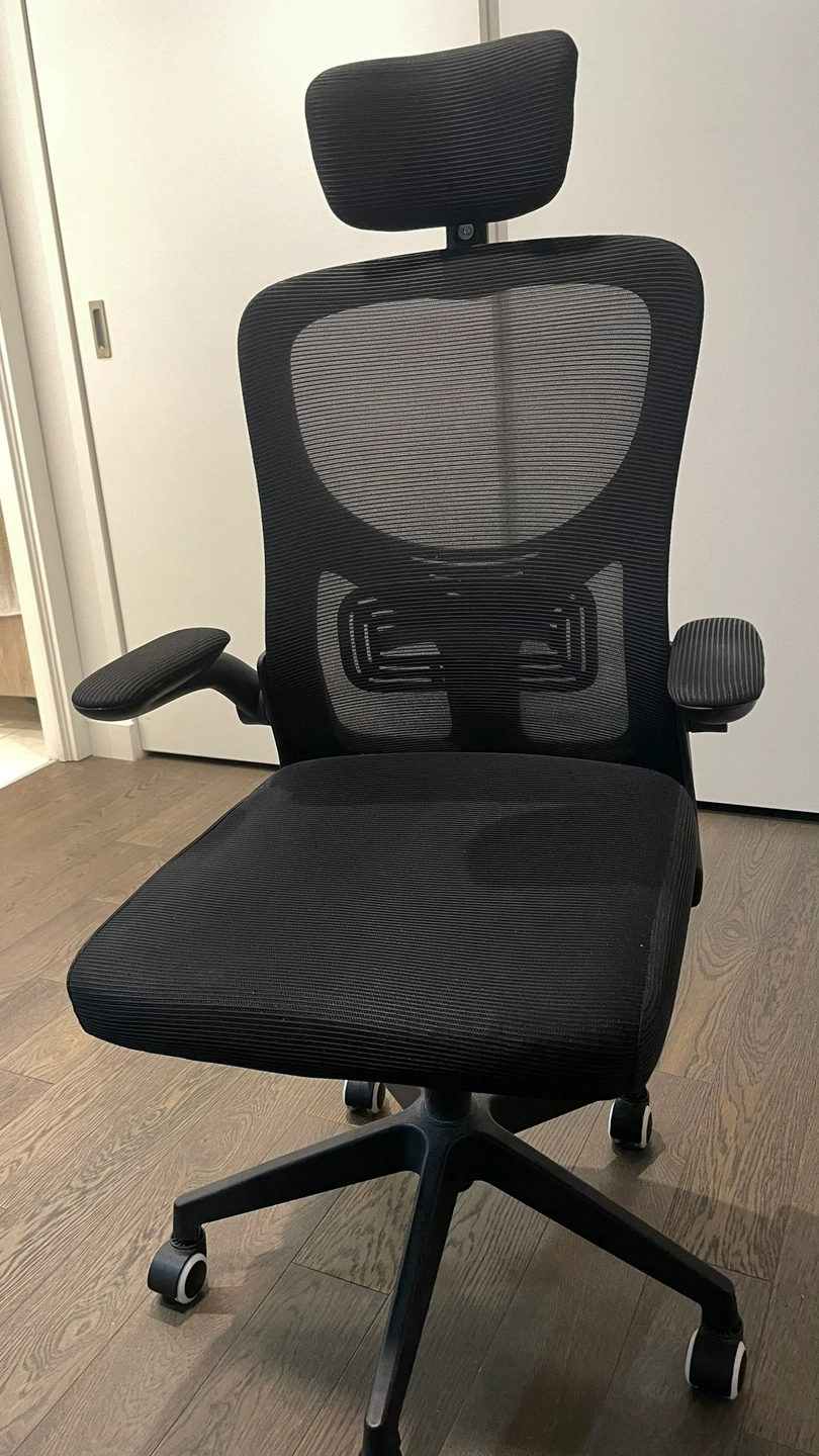 This used office chair is in good overall condition and fully functional. The only minor issue is a slight creaking sound when you sit down or shift your weight. Everything else, including the height adjustment, wheels, and backrest, works perfectly. A great budget-friendly option!