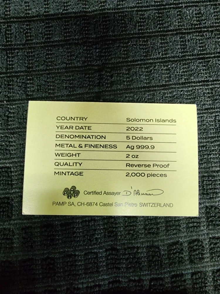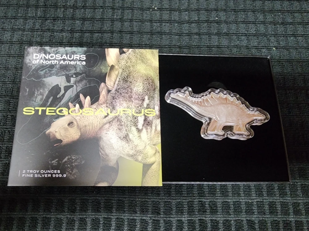 Selling a beautiful 2 oz fine silver Stegosaurus coin from the Dinosaurs of North America series. This coin is shaped like a Stegosaurus and comes with its original box and packaging. It's a unique piece for any coin collector or dinosaur enthusiast! The coin is from the Solomon Islands, dated 2022, and has a denomination of 5 Dollars. It's made of Ag 999.9 and weighs 2 oz. The quality is reverse proof and the mintage is 2,000 pieces