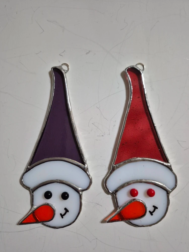 Handmade stained glass snowman tree ornament. One with red hat and one with light purple hat. Approx size 2.5 by 5 inches.