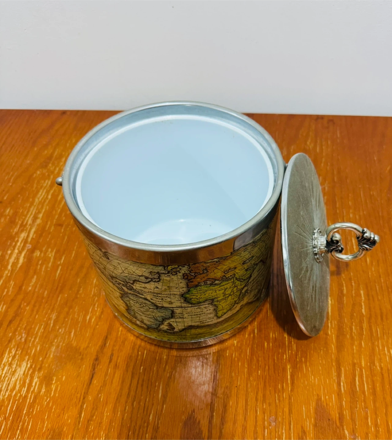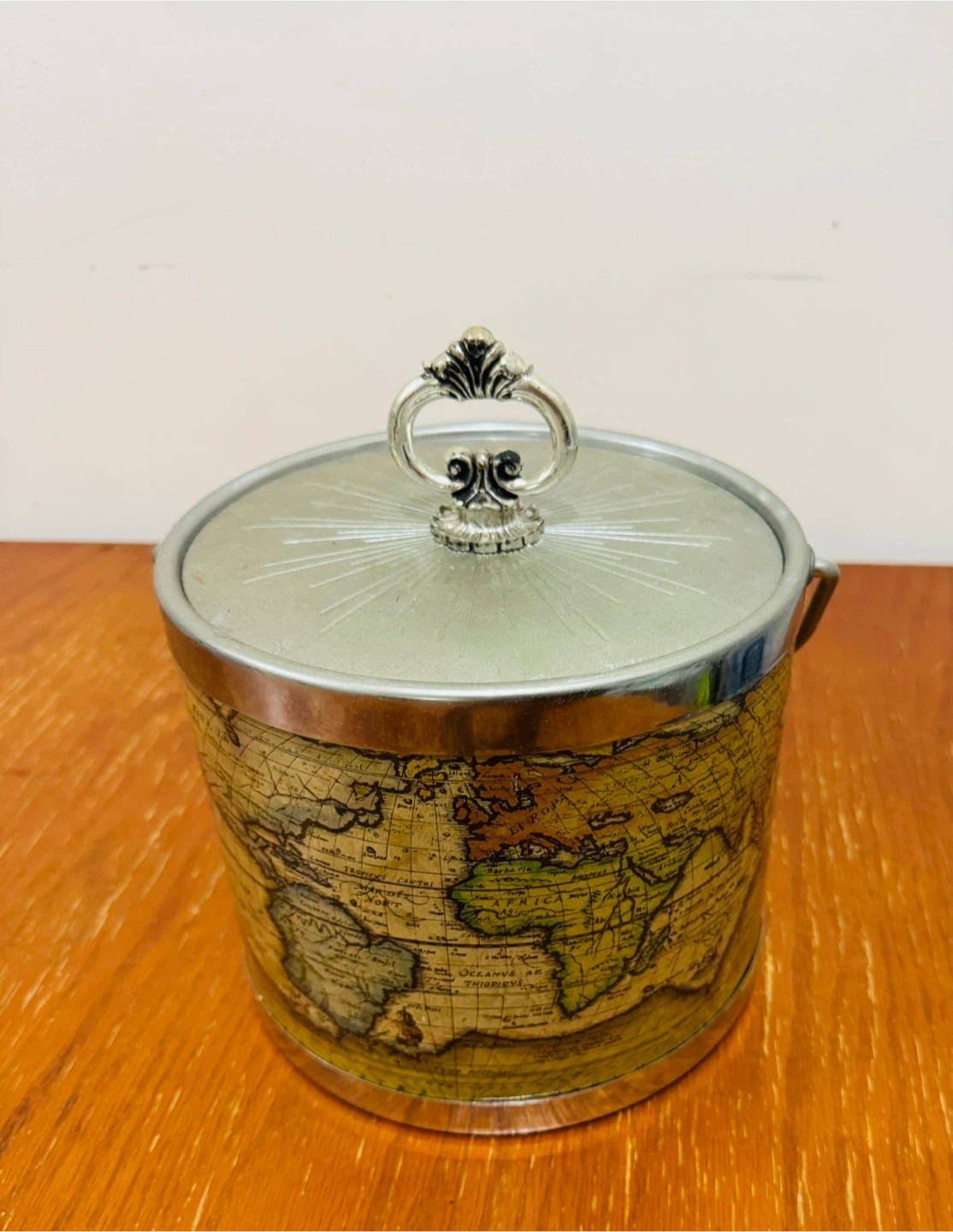 Selling a vintage ice bucket with a cool world map design! It's got a handle. Perfect for keeping your drinks chilled in style
