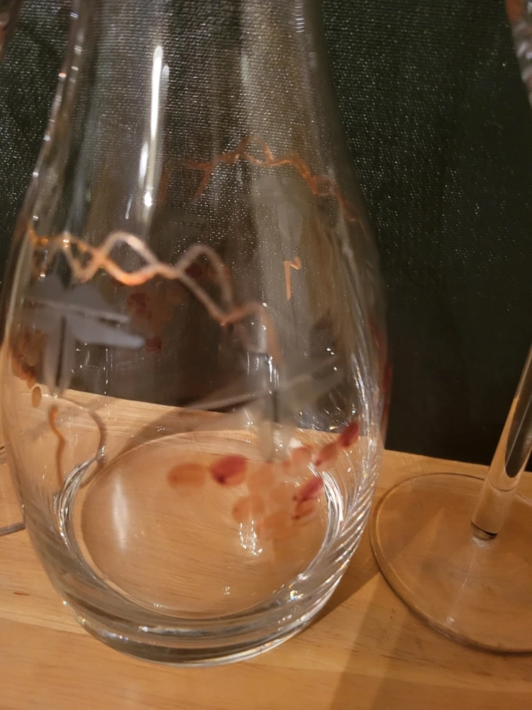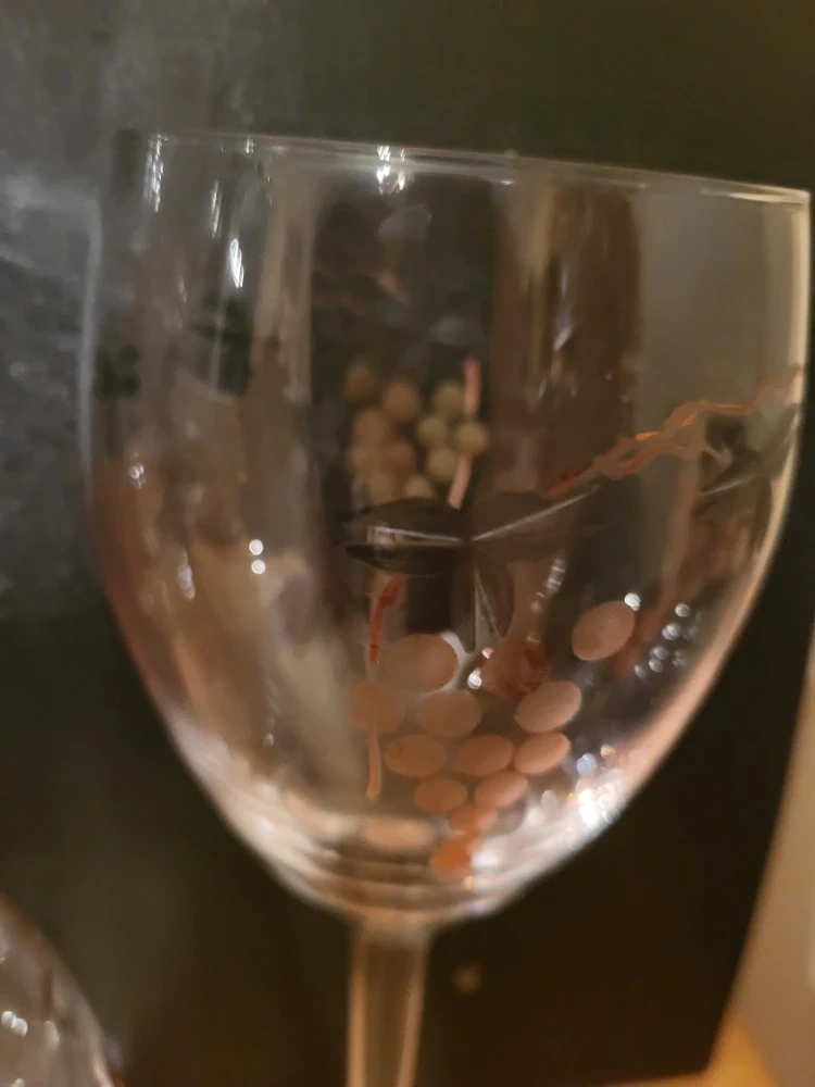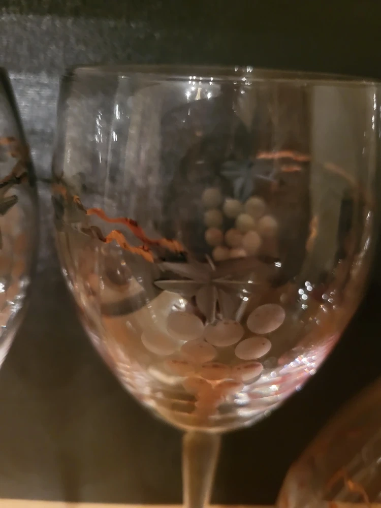Selling a set of vintage etched hand-painted wine decanter set with a grape and vine design. glasses and a decanter. They are in good condition.