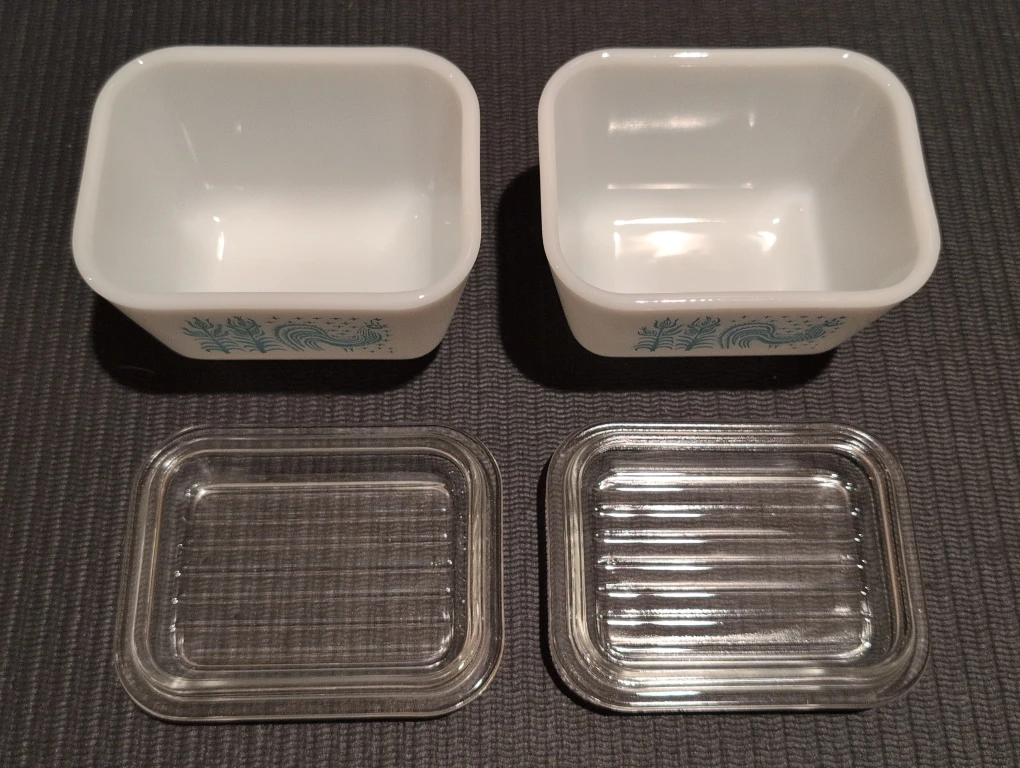 Selling a set of two vintage Pyrex butter dishes featuring the charming rooster pattern. These are in great condition and come with their original lids. Perfect for adding a touch of retro flair to your kitchen!