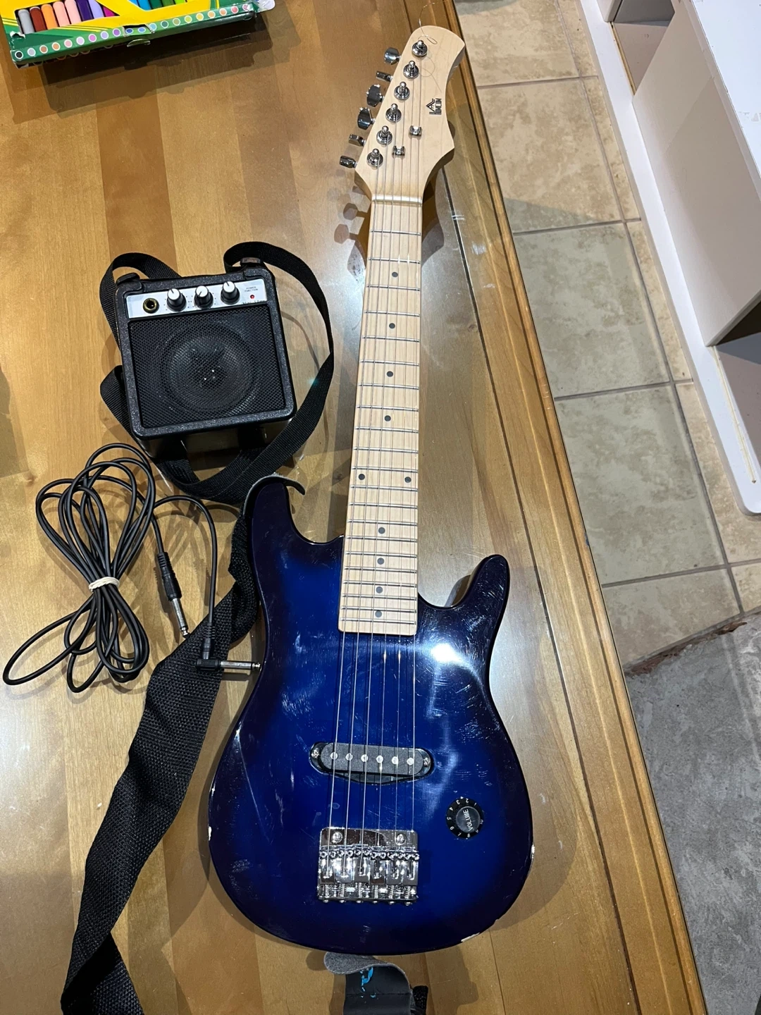 Selling a blue electric guitar that comes with a small amp and cable! It's in used condition, but still has lots of life left in it. Perfect for someone just starting out or looking for a practice guitar.
