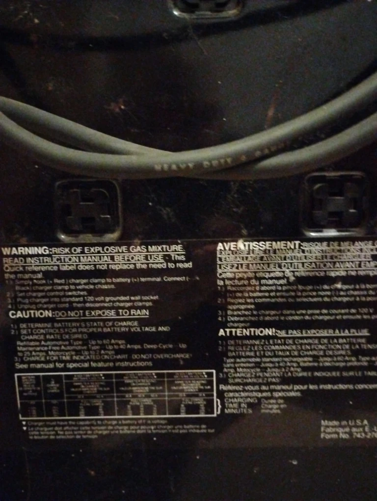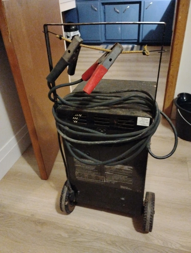 Selling a Motomaster battery charger, model 40/2/200 AMR-12V. It has charge selection for 12V low and 12V high or engine start. It also includes the cables.