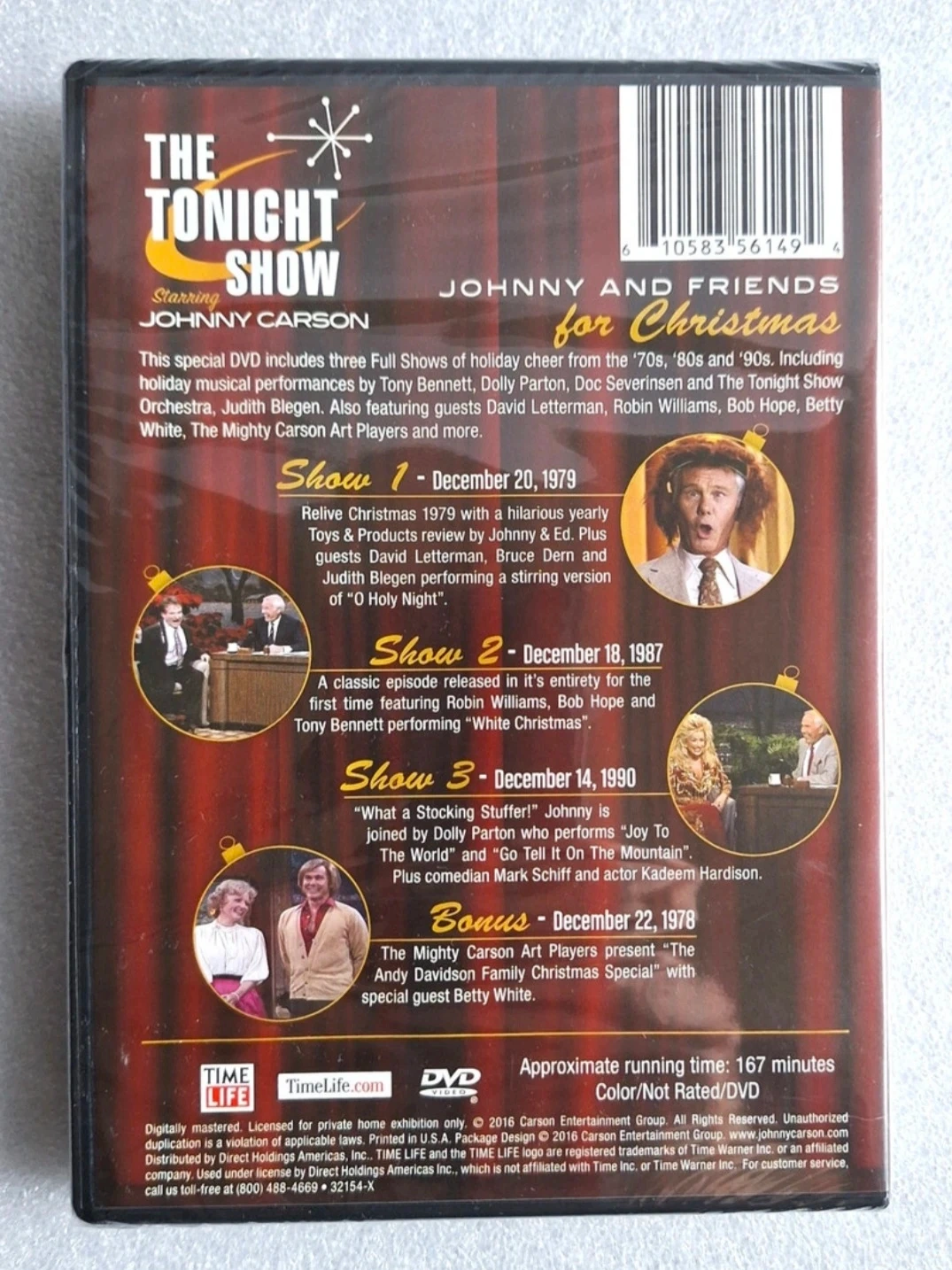 Selling a sealed copy of "Johnny and Friends for Christmas" DVD! This special DVD includes three full shows of holiday cheer from the '70s, '80s, and '90s. It features music performances by Tony Bennett, Dolly Parton, Doc Severinsen, and The Tonight Show Orchestra, Judith Blegen. Also featuring guests David Letterman, Robin Williams, Bob Hope, Betty White, The Mighty Carson Art Players and more! Approximate running time: 167 minutes