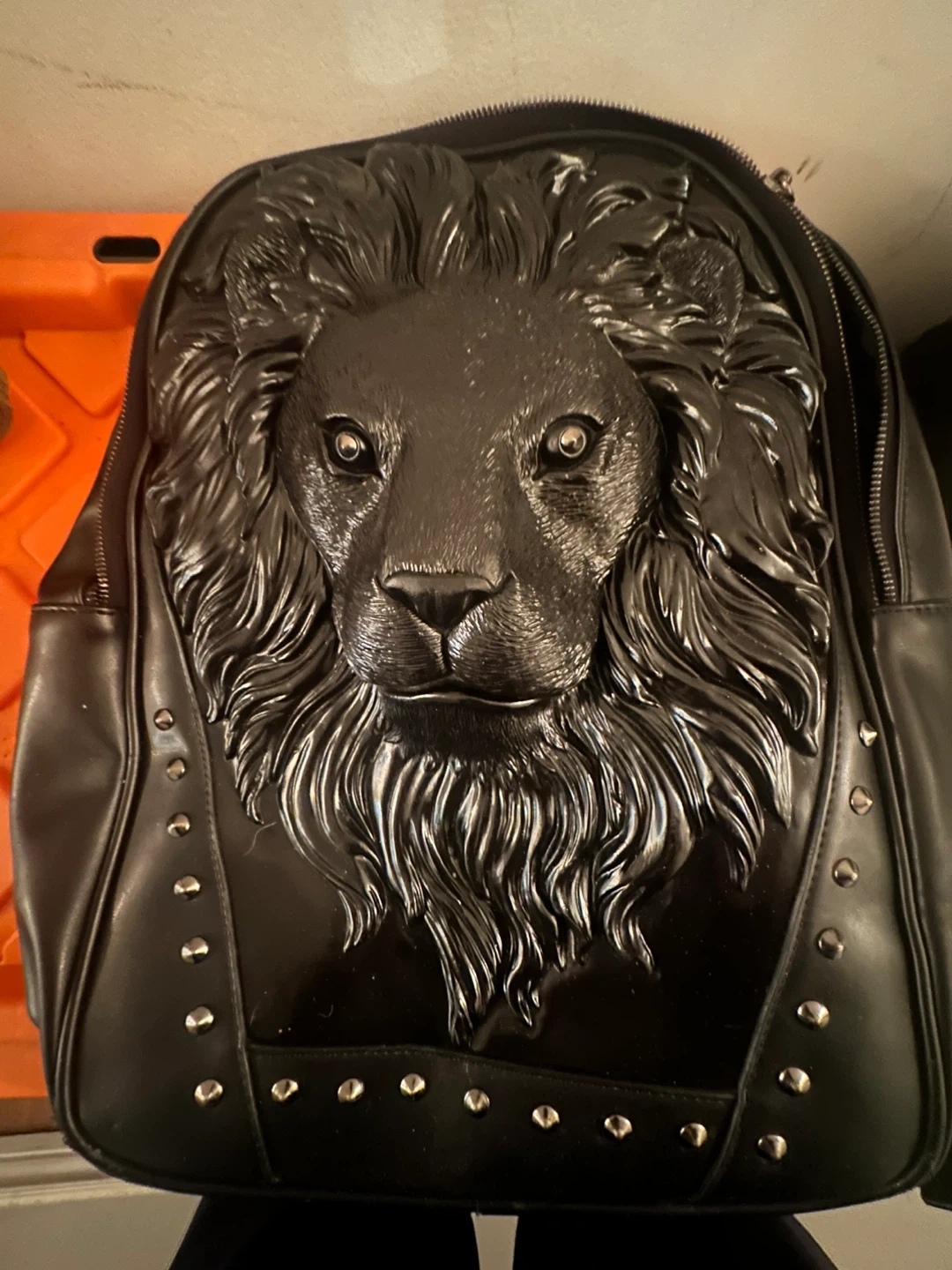 This black backpack features a striking lion embossed design. It's in great condition and ready for a new home. The backpack has adjustable straps for comfortable wear.