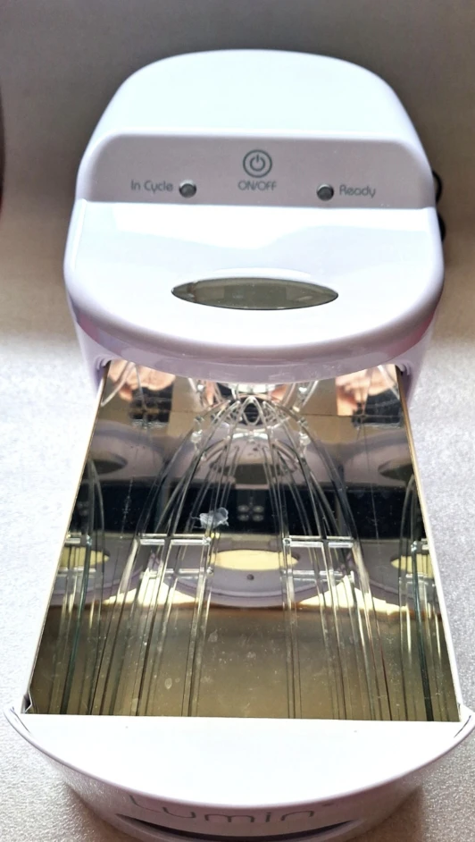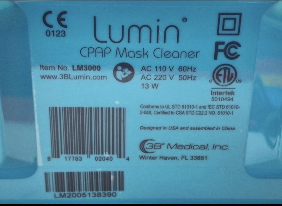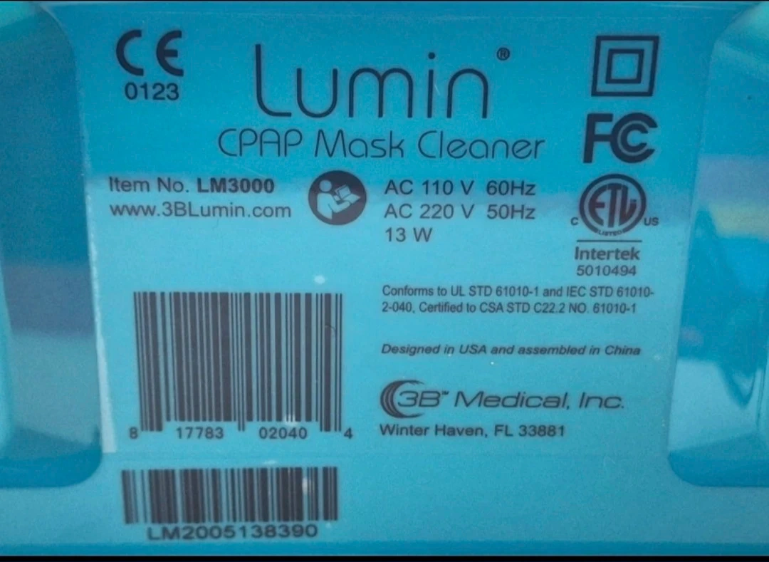 Selling a Lumin CPAP mask cleaner, model LM3000. It's designed in the USA and assembled in China. Operates at AC 110 V 60Hz and AC 220 V 50Hz, with a power consumption of 13 W