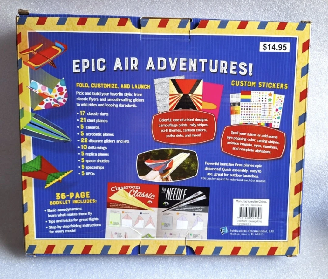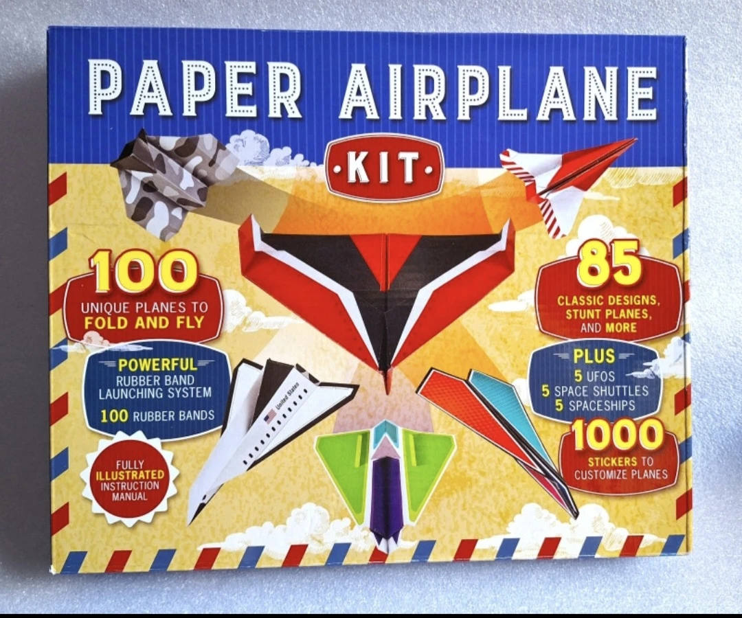 Get ready for some high-flying fun with this paper airplane kit! It's perfect for kids and adults alike who love to fold, customize, and launch their own unique planes. The kit includes everything you need to create 100 different airplane designs, with 85 classic styles and more. Plus, there are over 1000 stickers to personalize your creations! It also includes a 36-page booklet with basic aerodynamics, tips and tricks, and step-by-step folding instructions
