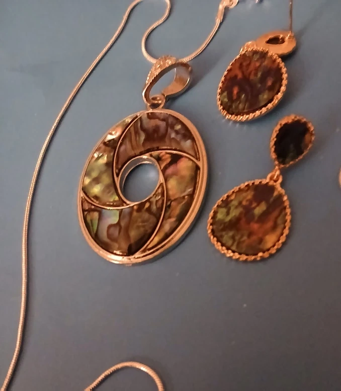 Selling a beautiful pendant necklace and earring set featuring abalone. The pendant has a unique circular design. The earrings are a matching set with an oval shape. They're in great condition and would make a lovely addition to any jewelry collection!