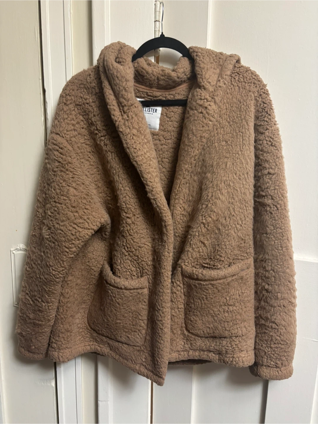 Selling a cozy Hollister California teddy jacket in a beautiful neutral tone! It's a size medium and features a hood and two front pockets. Perfect for layering on chilly days!