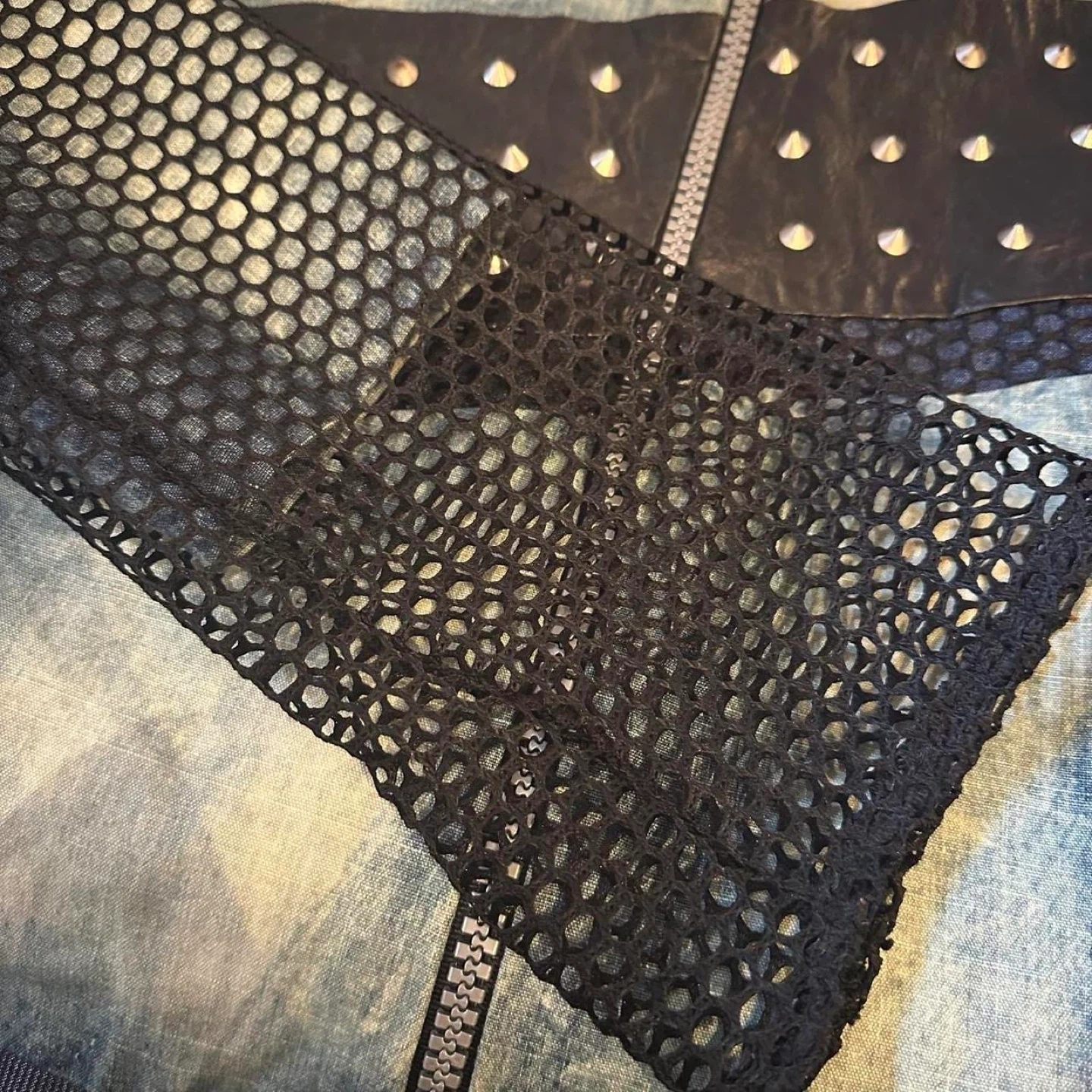 Another one i’m releasing from my personal collection, this crazy one of a kind jacket features various types of mixed fabric, studs, and fishnet sleeves.