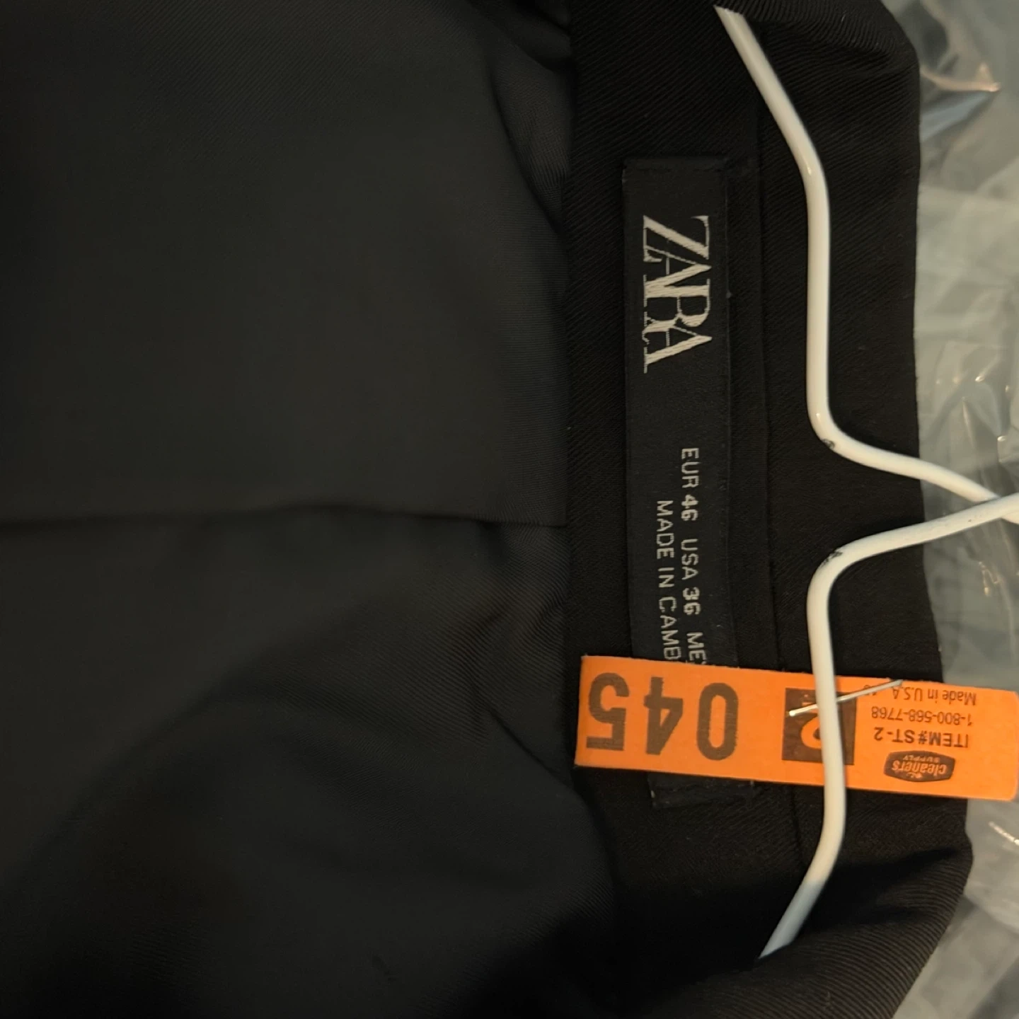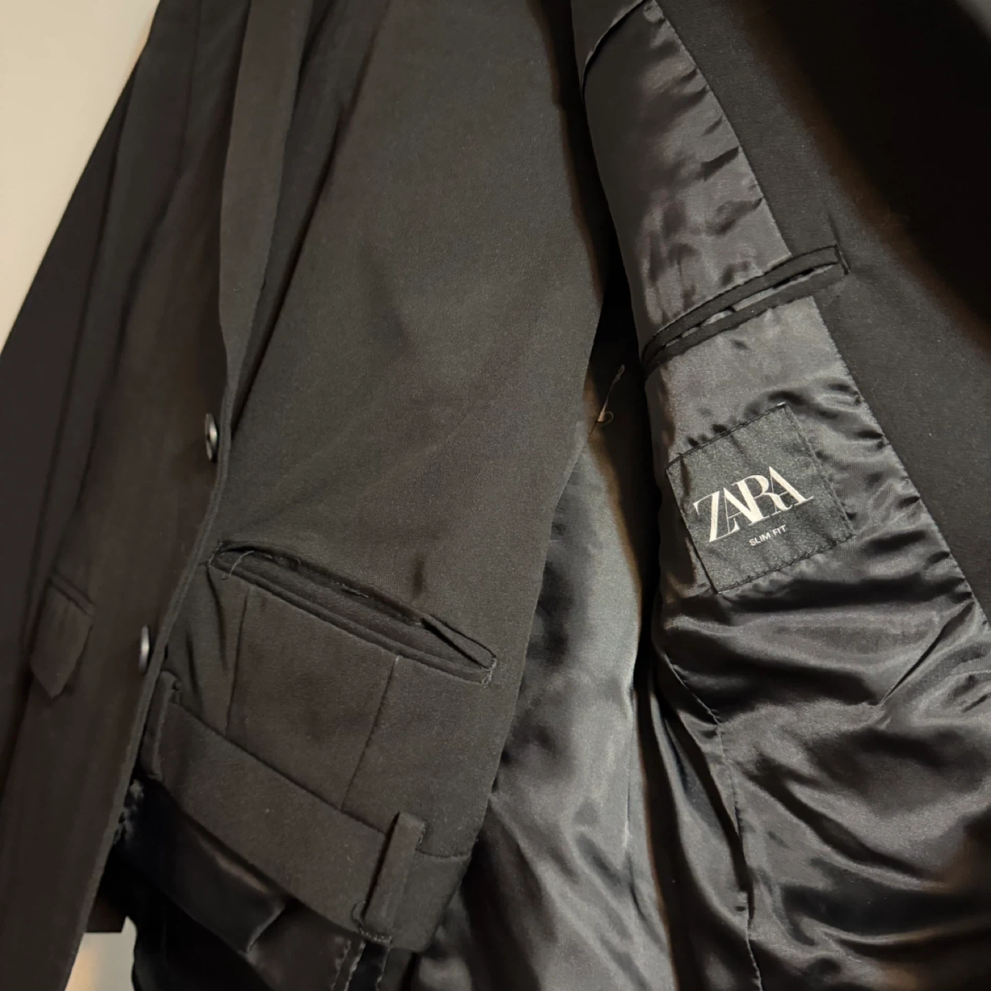 Selling a Zara slim fit suit in black. The size is EUR 46 and USA 36. It's in great condition and ready for a new home!