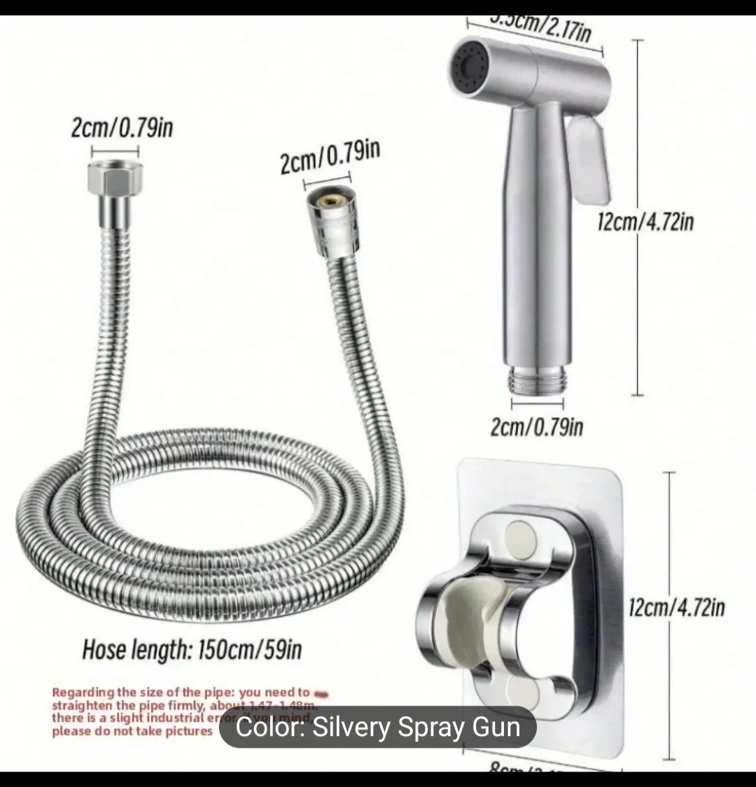 This is a silvery bidet sprayer. The hose length is 150cm/59in. It also comes with a mount.