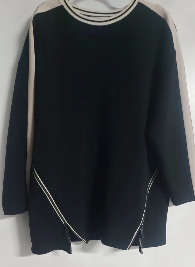 A stylish black viscose sweater from Melanie Lyne! It features a unique design with zippers and contrasting stripes, adding a touch of sophistication to your wardrobe