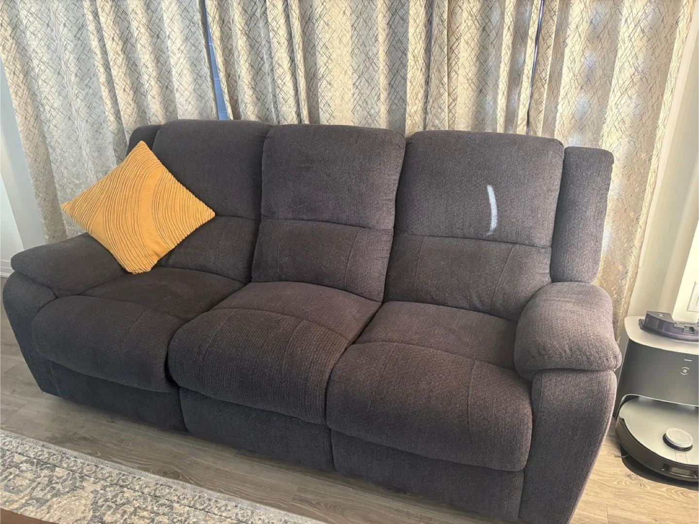 Selling a comfy grey reclining sofa and loveseat set with removable back. Pet free home. Perfect for a living room or entertainment space. The loveseat has a built-in console with cupholders for added convenience. Both pieces are in good condition and ready to find a new home!